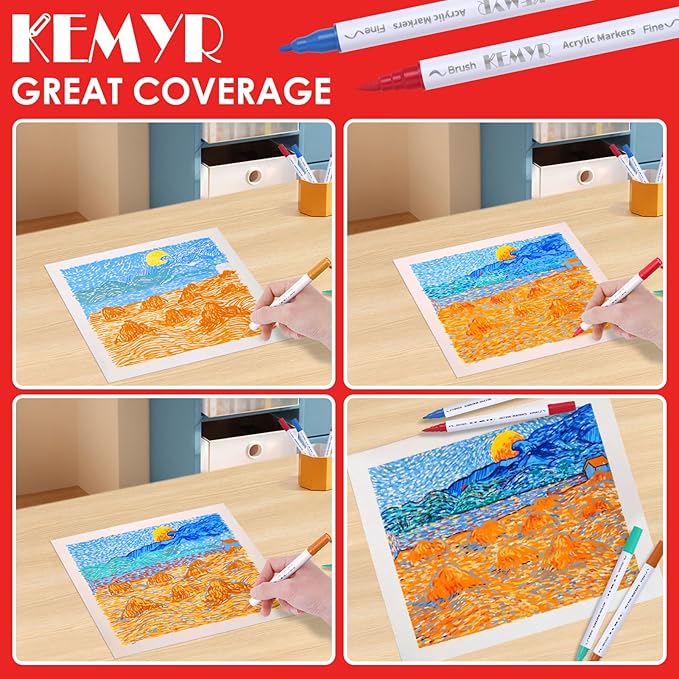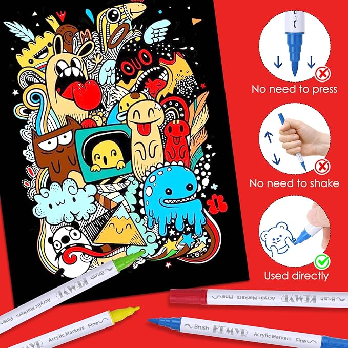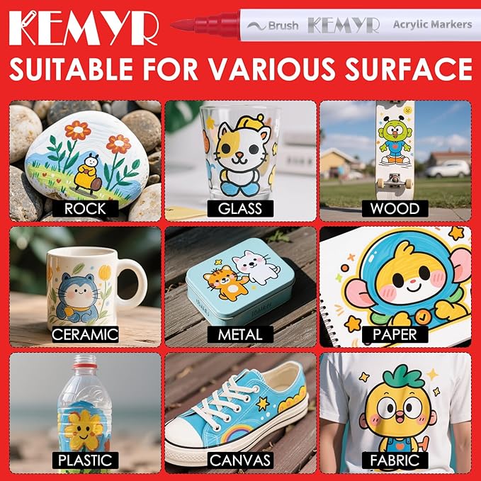 • Dual Tip Acrylic Paint Pens----Each KEMYR pen is equipped with a 1 mm fine tip for lines and details work, and a 1 - 5 mm brush tip for filling large areas and coloring. By changing the brush pressure, you can create different strokes, saving the trouble of changing tips.