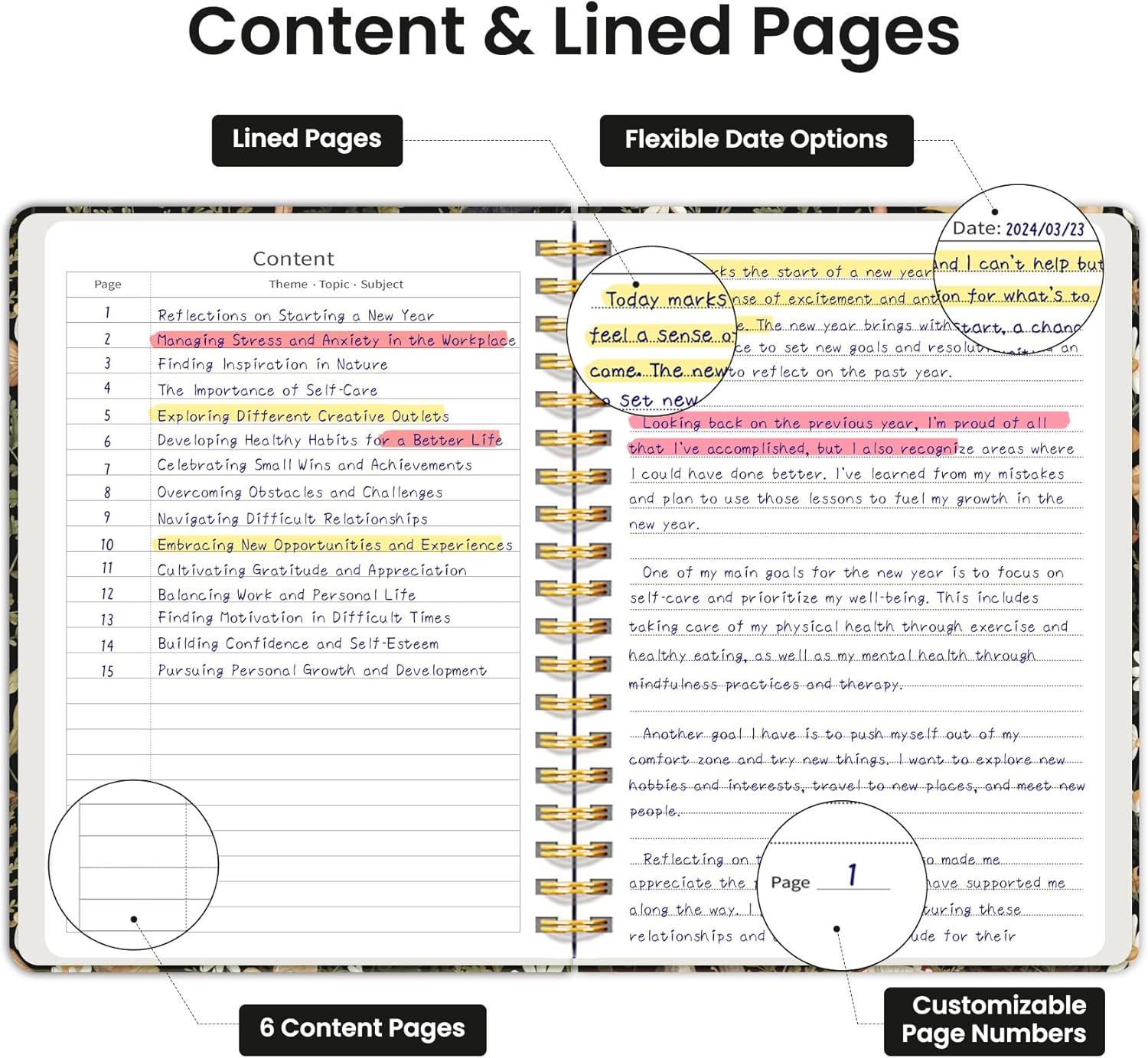 • Structured College-Ruled Pages: Featuring 7mm college-ruled lines, this journal notebook helps keep your writing organized and legible. The evenly spaced lines are perfect for structured notes, work lists, or detailed writing, making it an excellent choice for school students, professionals, and writers alike. It also includes 6 content pages, perfect for creating an index for easy reference.