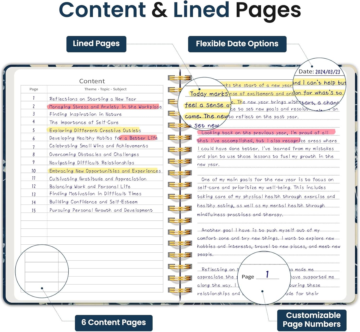 • Structured College-Ruled Pages: Featuring 7mm college-ruled lines, this journal notebook helps keep your writing organized and legible. The evenly spaced lines are perfect for structured notes, work lists, or detailed writing, making it an excellent choice for school students, professionals, and writers alike. It also includes 6 content pages, perfect for creating an index for easy reference.