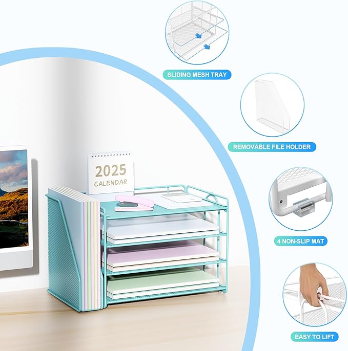 • ▶ Save desktop space: The office desk organizer provides you with 4 paper trays and a vertical file organizer, providing ample space for your desktop and helping to keep your desktop organized and free of clutter.