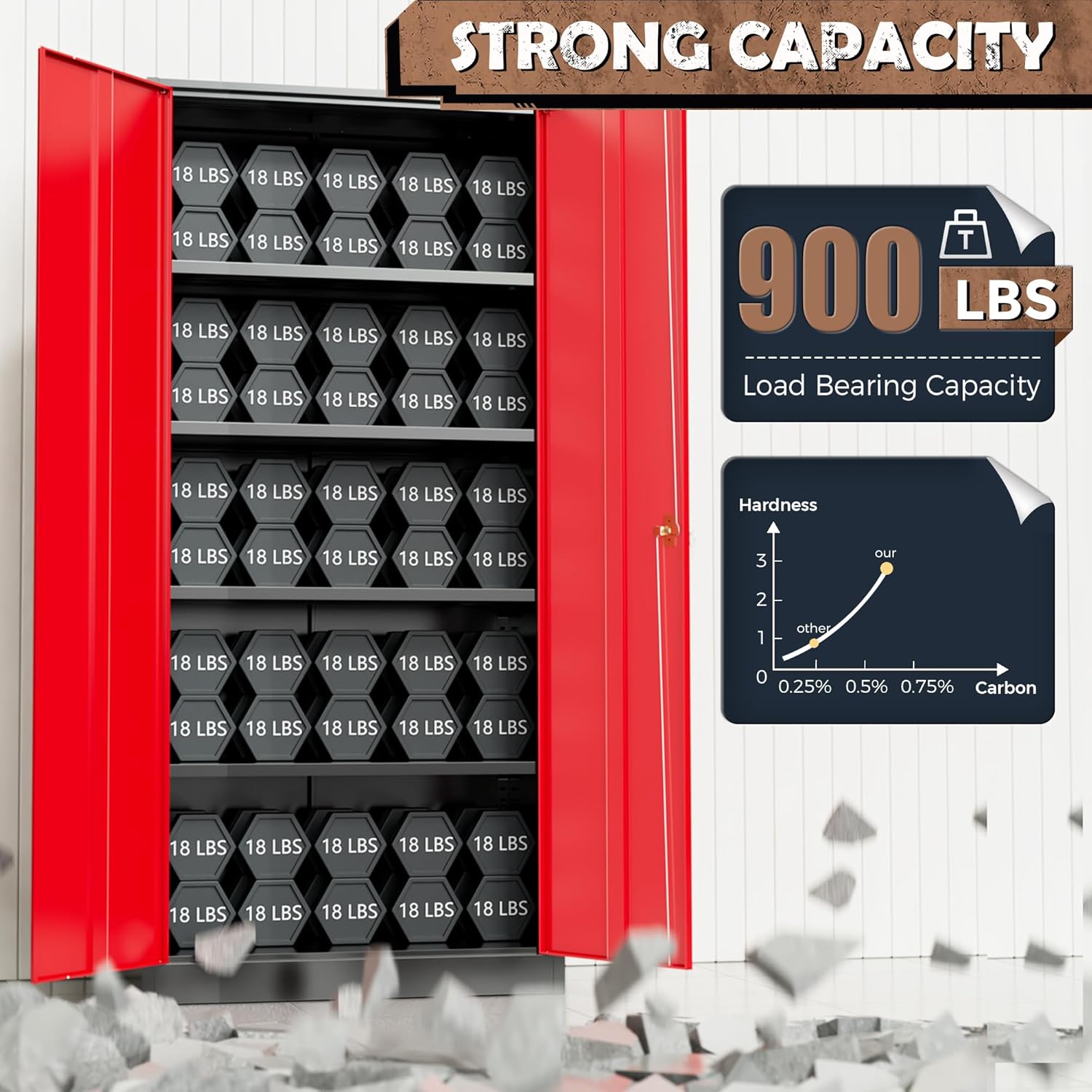 • ✅【4 Adjustable Shelves】Metal cabinet is made of high quality cold rolled steel, prevent from scratching, denting, chipping; adopting powder coat, anti-rust and colorfast. There are 4 adjustable shelves and 5 tier storage space meet your needs to store different size items, each shelf of locking storage cabinets can load 180lbs