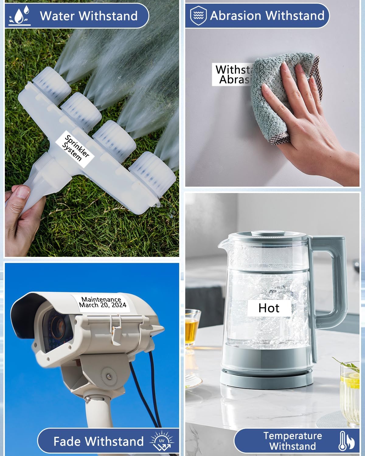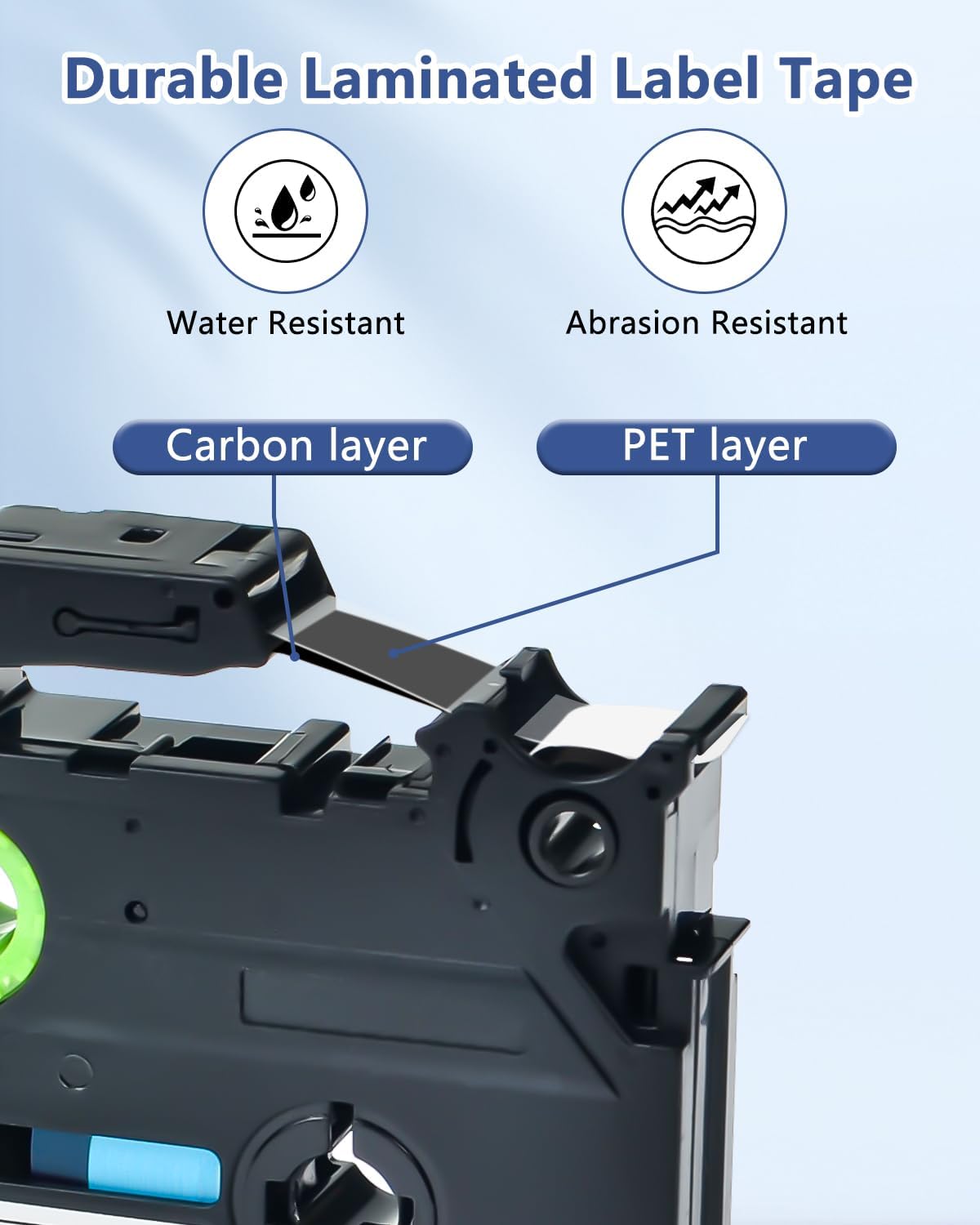 • Size & Color & Features: Width of Tape: 18mm 0.7 inch (3/4 inch); Length of Tape: 8m (26.2 feet); Color of Tape: Black Text Print on White Tape. Feature of Tape: Laminated, Strong Adhensive, Chemical and Water Resistant, Abrasion Resistant, Temperature Resistant, Fade Resistant.