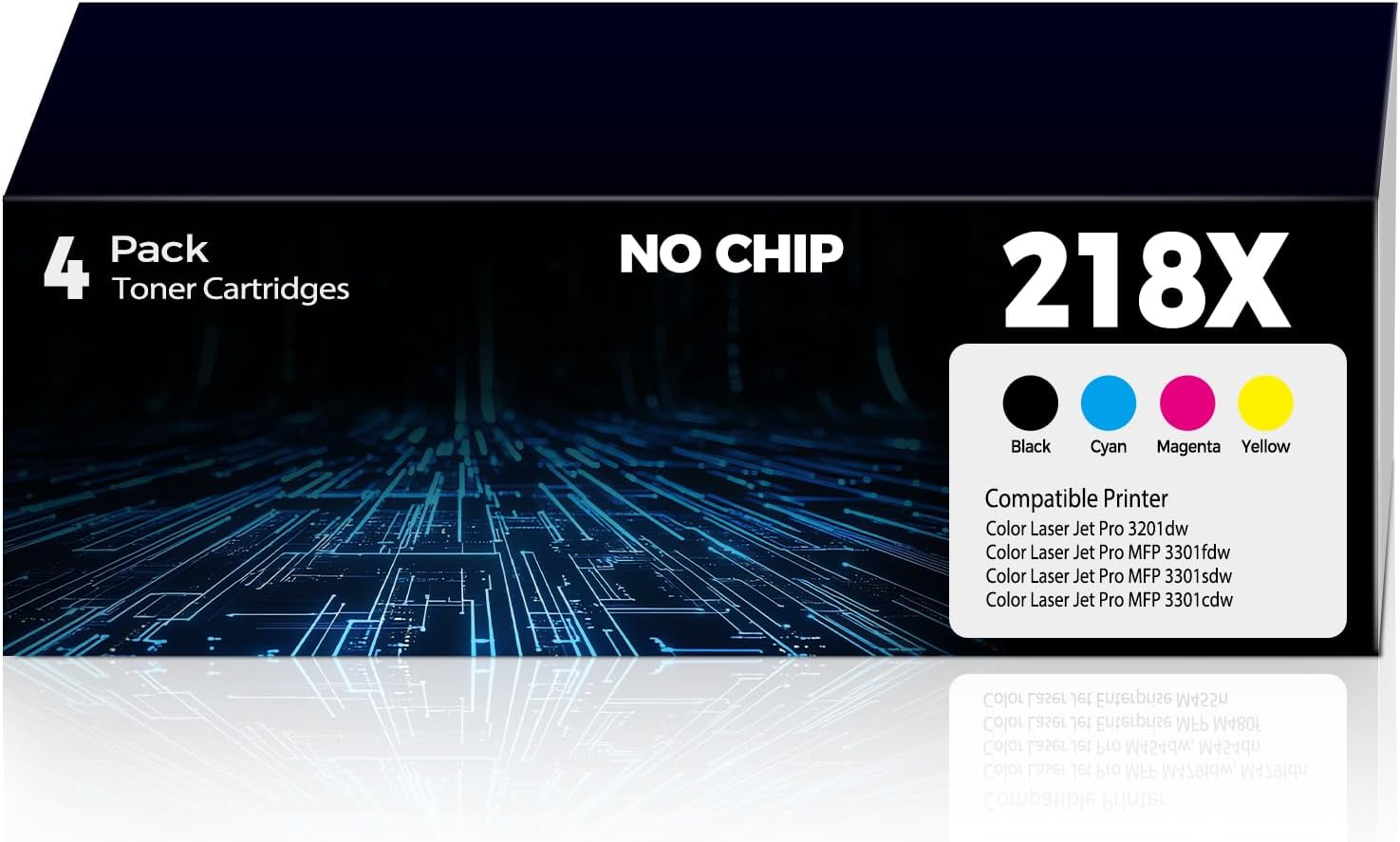 • 218X Toner Cartridges 4 Pack (No Chip) Printer Compatibility: 218X toner are compatible with HP Color Laser Jet Pro 3201dw, Color Laser Jet Pro MFP 3301fdw, Color Laser Jet Pro MFP 3301sdw, Color Laser Jet Pro MFP 3301cdw, Color Laser Jet Pro 3201dw toner cartridges, Color Laser Jet Pro MFP 3301fdw toner cartridges, Color Laser Jet Pro MFP 3301sdw toner cartridges, Color Laser Jet Pro MFP 3301cdw toner cartridges, 3301 3302 Series Wireless All-In-One Laser Printer.