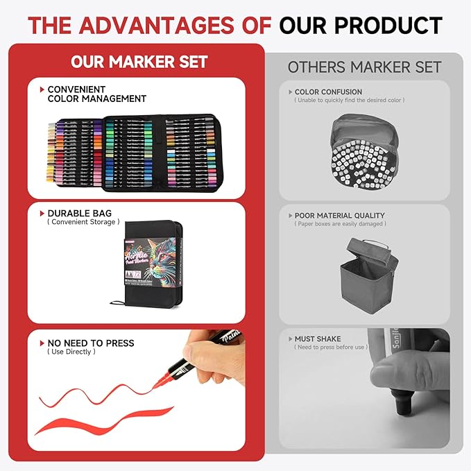 • 【CONVENIENT STORAGE & CLASSIFICATION】Unlike traditional box sets, our acrylic paint markers come in a stylish carrying case with an organized layout. Each marker is securely stored in a separate compartment, making it easy to find the right color quickly. The lightweight, portable design makes it convenient to carry your markers wherever you go, perfect for artists, crafters, and DIY enthusiasts who love to create on the go.