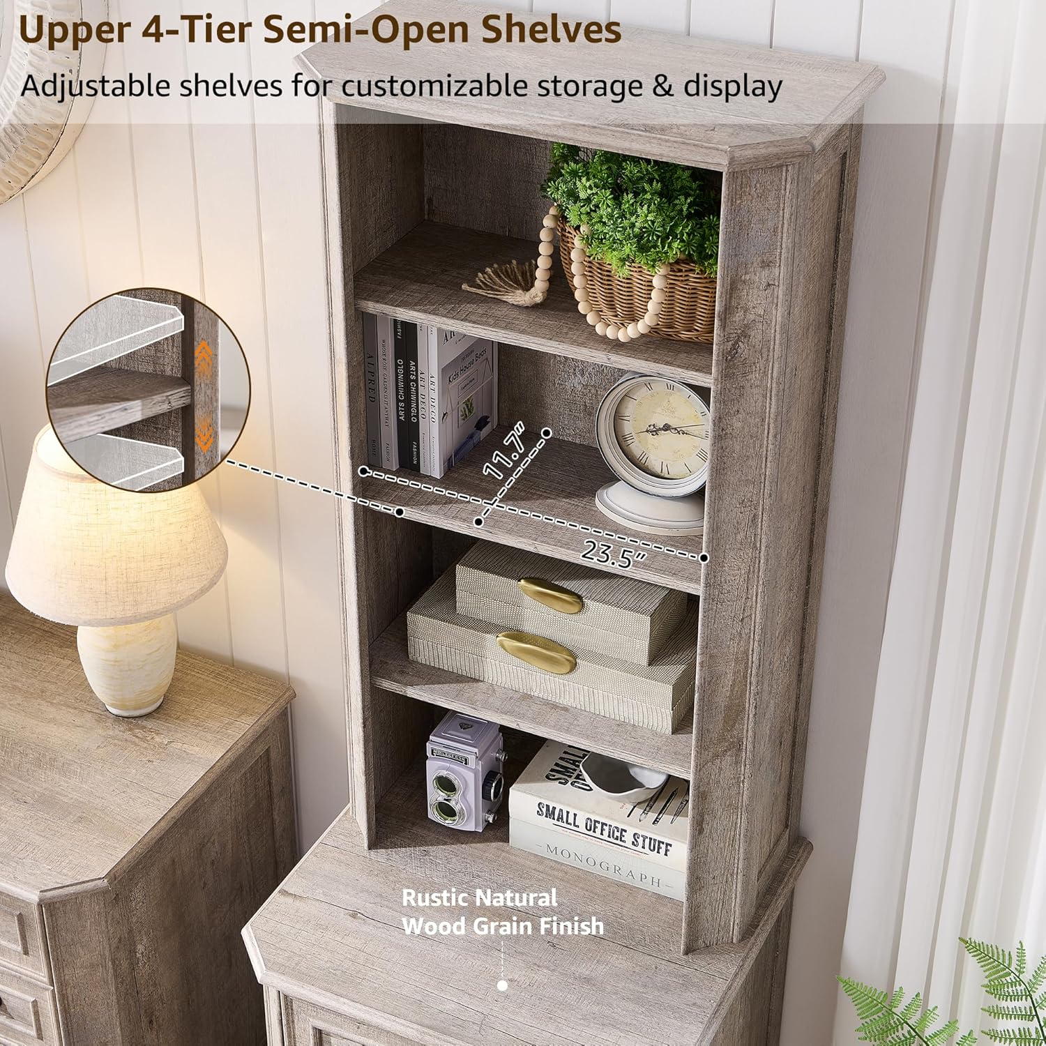 • 4 Adjustable Open Shelves & Spacious Display Surface: This wooden bookshelf with storage features four adjustable semi-open shelves, each with three height settings (up or down 2.5"), allowing you to customize shelf spacing between 7.2”-14.7” to fit books, trophies, decorative items, and frequently accessed items. The 23.5-inch wide tabletop expands your display area while bringing a touch of warmth and farmhouse style to your space