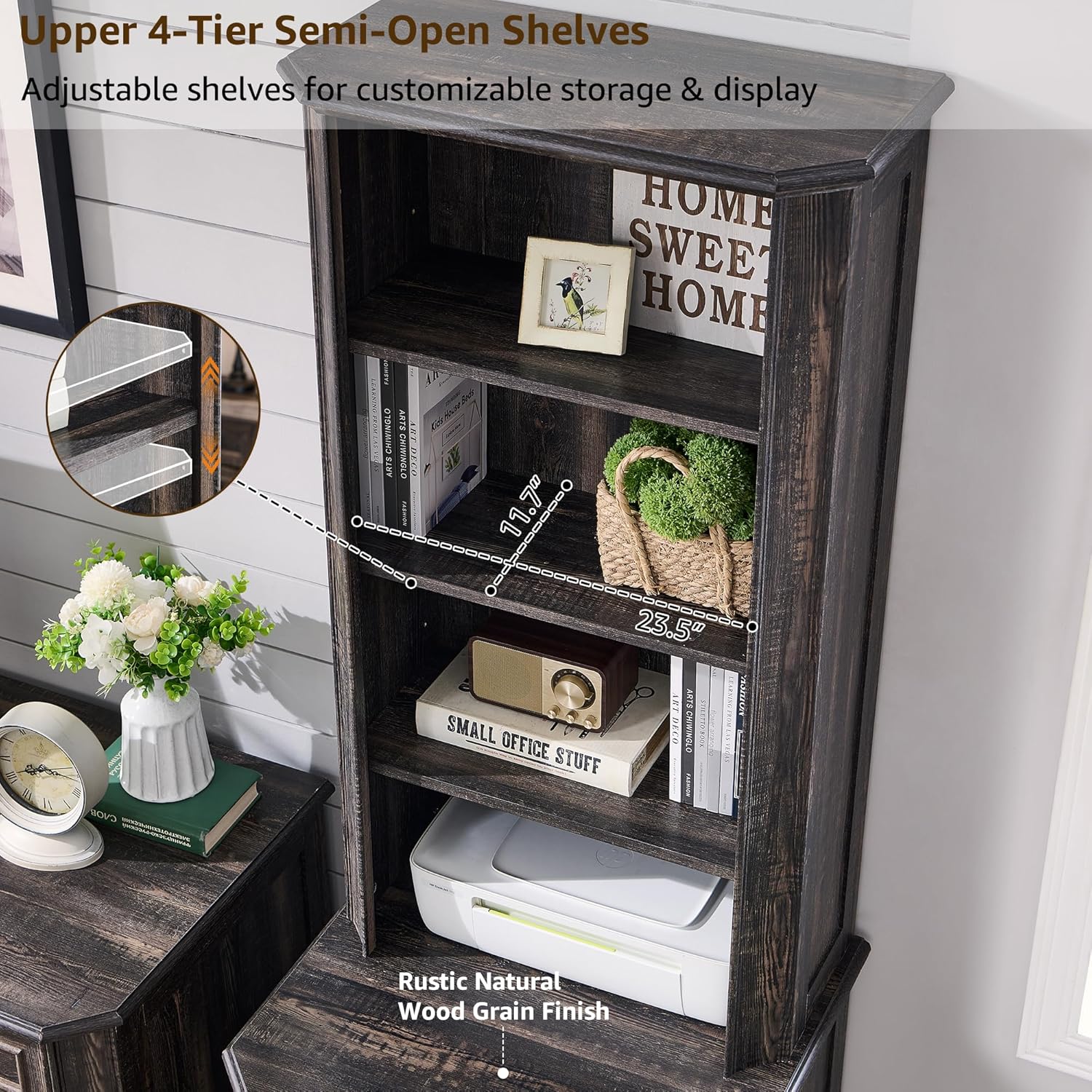 • 4 Adjustable Open Shelves & Spacious Display Surface: This wooden bookshelf with storage features four adjustable semi-open shelves, each with three height settings (up or down 2.5"), allowing you to customize shelf spacing between 7.2”-14.7” to fit books, trophies, decorative items, and frequently accessed items. The 23.5-inch wide tabletop expands your display area while bringing a touch of warmth and farmhouse style to your space