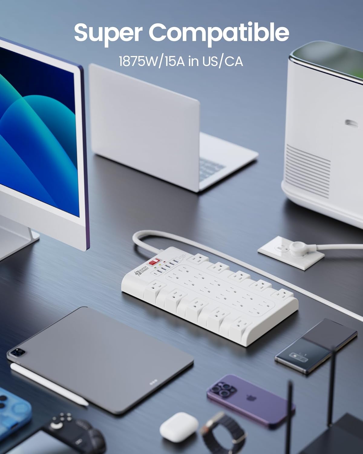 • 【28-in-1 Versatile Power Strip】 FCC, RoHS safety certified, with extension cord and flat plug certified by UL. Superdanny power strip surge protector has 22 grounded 3-prong outlets and 6 USB ports, providing power for all devices that you need to plug in at one location. Perfect for gaming or media set up, surround sound system, TV, phone, tablet pc, laptop, computers, lamps, and other devices simultaneously.