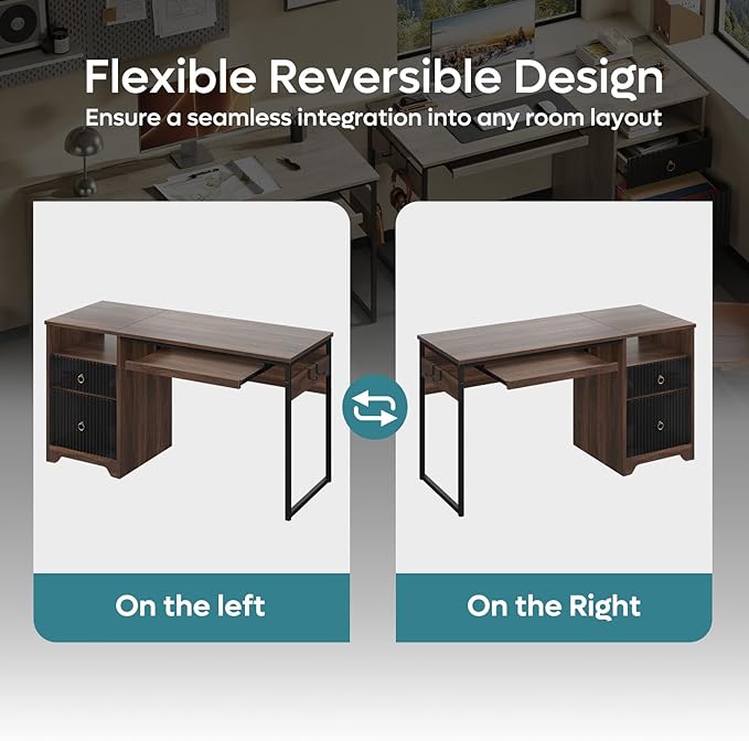 • User-Friendly Design: The home office desk features a flexible keyboard tray for comfortable typing. Its reversible pedestal can be installed on either the left or right side, ensuring seamless integration into any room layout. Additionally, two practical hooks provide convenient storage for headphones or other accessories
