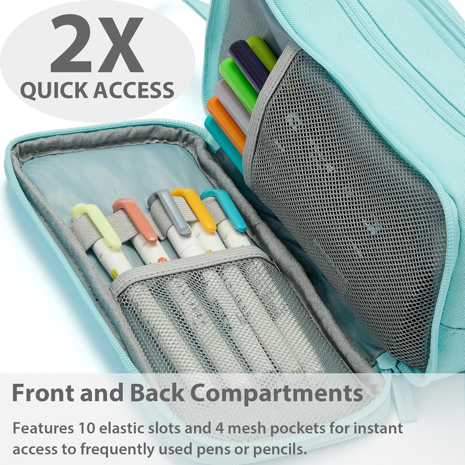 • Our pouches are 3 compartment design. The center pocket is wide opening, making it effortless to instantly store and organize your items. The side pocket is designed with 1 mesh pocket and 4 slots. They have a netbag on the bottom to prevent pens and pencils from falling out.