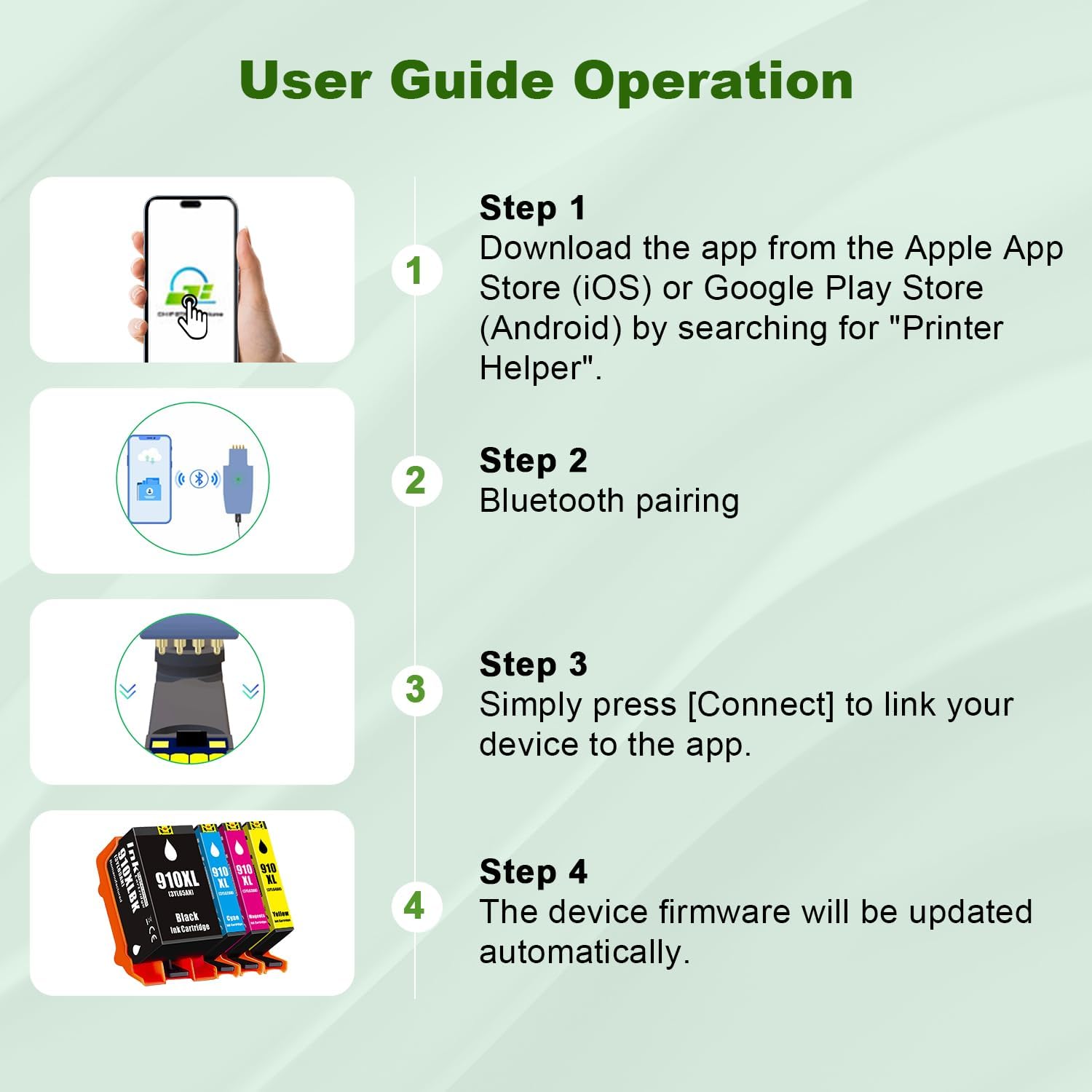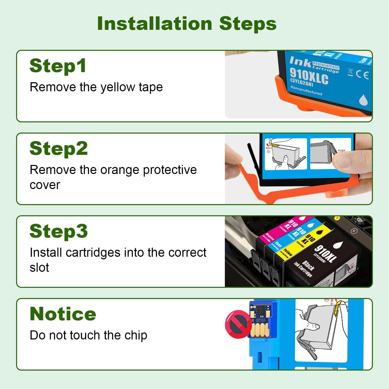 • Package Includes: 1 × 910XL Black Ink Cartridge, 1 × 910XL Cyan Ink Cartridge, 1 × 910XL Magenta Ink Cartridge, 1 × 910XL Yellow Ink Cartridge, and 1 × Upgrade Device (Note: Non OEM ink cartridges )