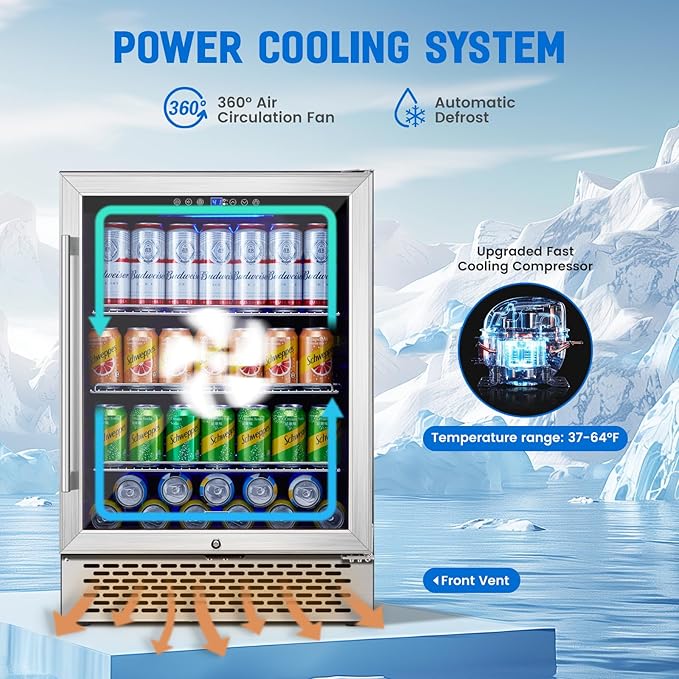 • 【Powerful & Quiet Cooling Compressor】: The under counter beverage refrigerator is equipped with a high-performance compressor that can achieve fast cooling and maintain a constant temperature range of 37 to 64° F. The low-noise operation ensures a quiet environment, allowing you to enjoy your favorite beverage at work or during leisure time