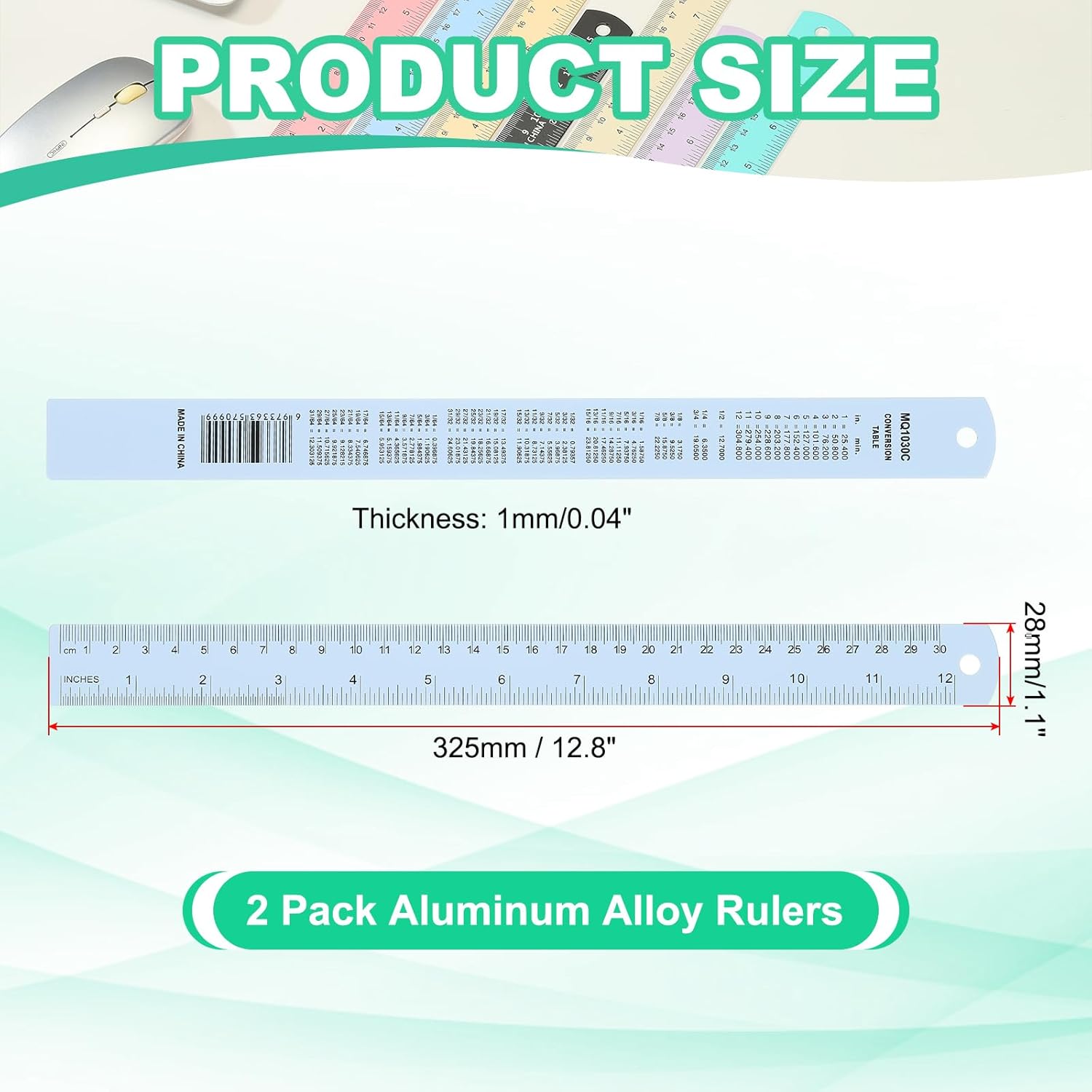 • Advantage: Made of quality aluminum alloy material, ensuring durability, rust resistance, and long-lasting use; Convenient design with rounded and smooth edges, hanging hole for easy storage, and compact size for portability. Laser etched and black anodized scales for bold, and never-fading markings; Double-sided markers with both inch and centimeter graduations, including a conversion table.