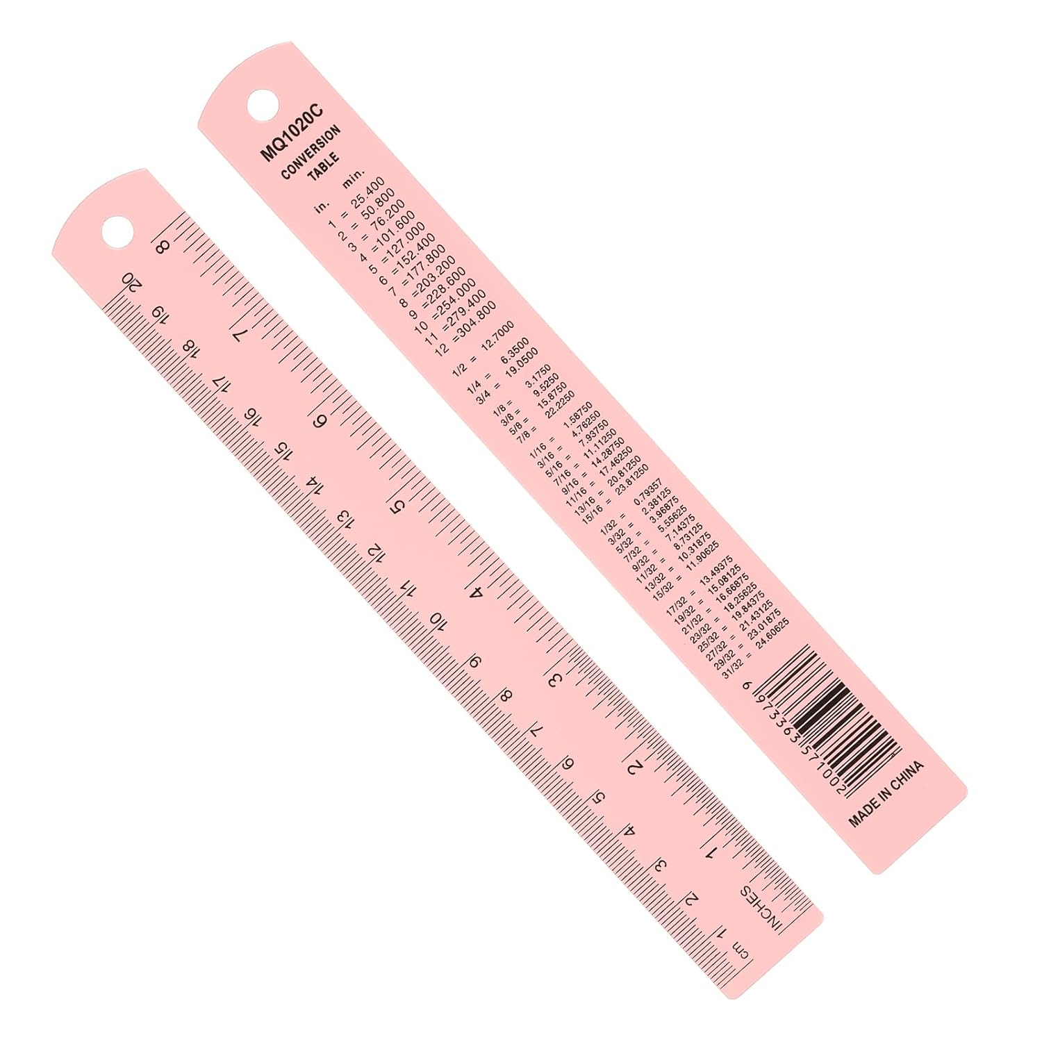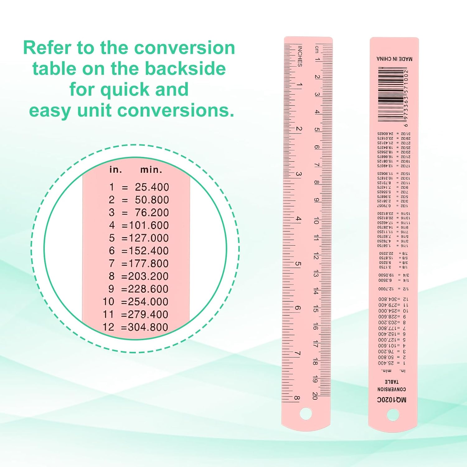 • Instruction: Use the ruler for precise measurements and calculations in both inches and centimeters. Refer to the conversion table on the backside for quick and easy unit conversion. Hang the ruler using the provided hole for convenient storage and accessibility.