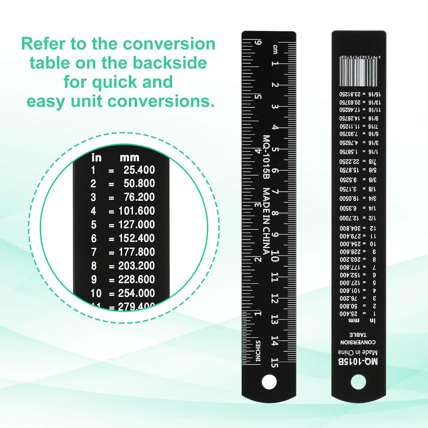 • Instruction: Use the ruler for precise measurements and calculations in both inches and centimeters. Refer to the conversion table on the backside for quick and easy unit conversion. Hang the ruler using the provided hole for convenient storage and accessibility.
