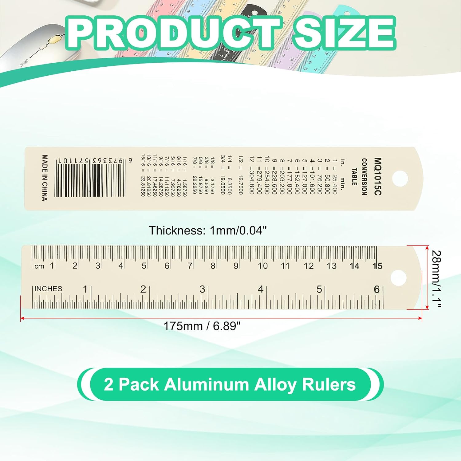 • Instruction: Use the ruler for precise measurements and calculations in both inches and centimeters. Refer to the conversion table on the backside for quick and easy unit conversion. Hang the ruler using the provided hole for convenient storage and accessibility.