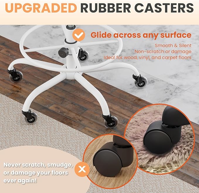 • UPGRADED RUBBER WHEELS: To accommodate different users needs, our high office chairs choose expensive but high quality rubber wheels. These rubber casters are friendly to any types of floors, and never scratch, damage or smudge your wood, vinyl, or carpet floors. We believe a better office chair is designed for users convenience in every aspects.