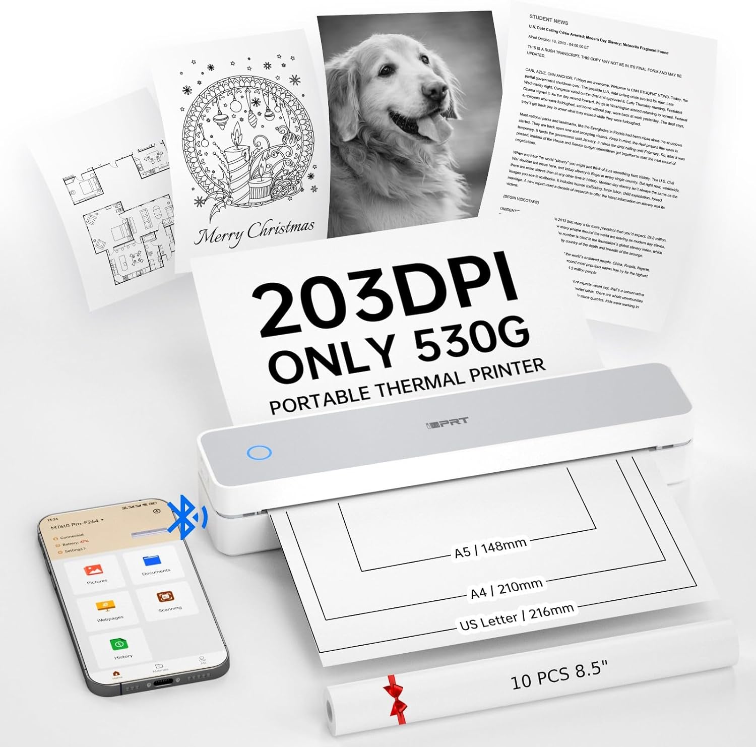• Inkless Printing Technology: This advanced bluetooth printer utilizes thermal technology, no ink cartridges needed! With a resolution of 203 DPI, clear printing and high speed—completing a US Letter/A4 page in just 4-6 seconds. ( Note: Supports black-and-white printing exclusively and requires thermal paper. )