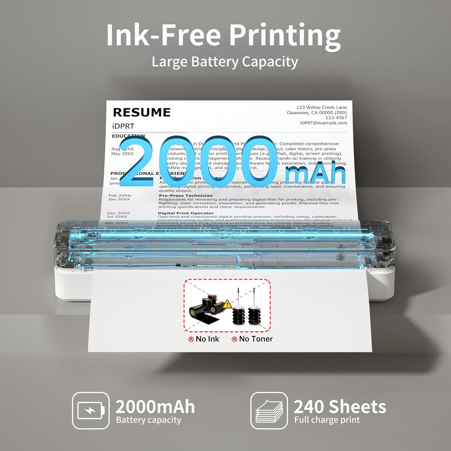 • Long-Lasting Battery: This compact printer features a built-in 2000mAh rechargeable battery, capable of printing up to 240 sheets (approx. 4 hours of continuous use). The small printer for professionals - print contracts, documents and files effortlessly at home, office or in a vehicle