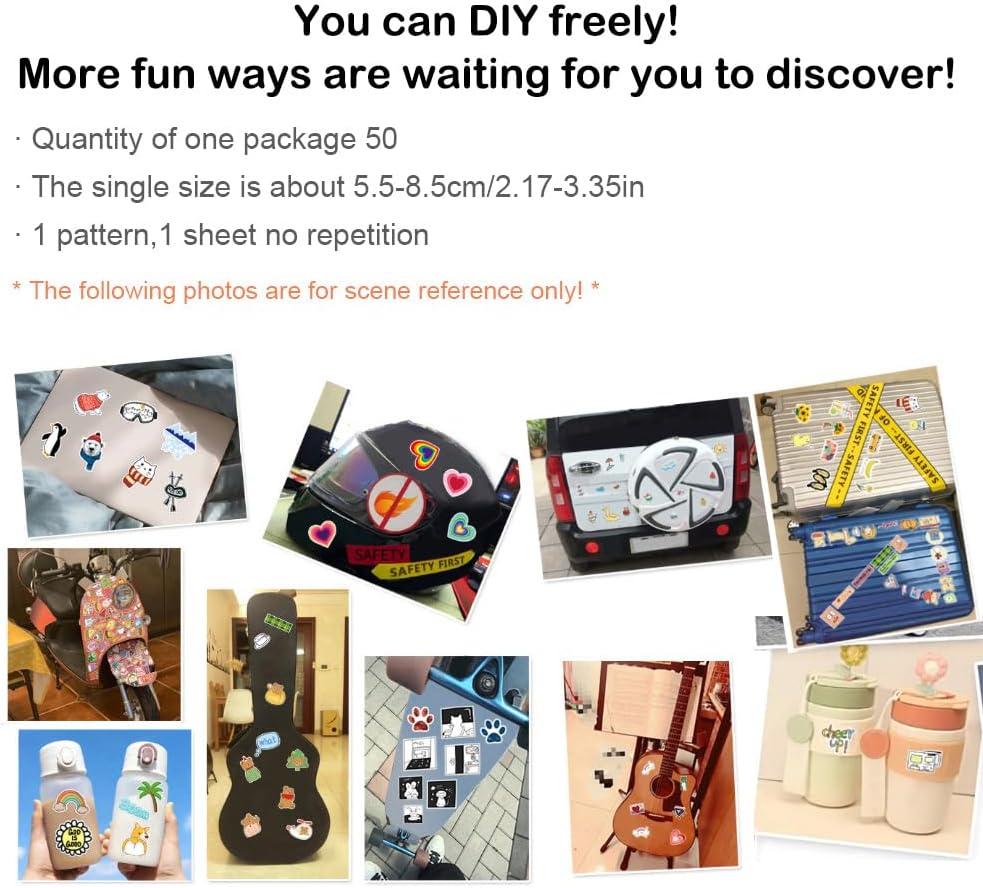 • 【50 Waterproof Stickers】:These are large-sized stickers, with each sticker being approximately 10cm in size (irregular shape). They are suitable for use on luggage, laptops, bicycles, motorcycles, stationery, scooters, furniture, refrigerators, mobile phones, water cups, helmets, cars, and anywhere else to show off your taste and personality and add more color to your life.