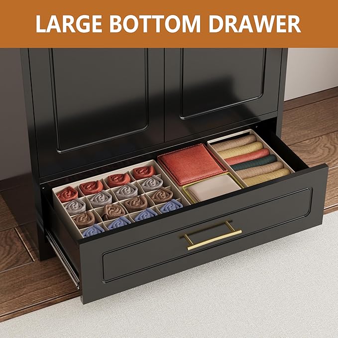 • [STURDY AND RELIABLE] Crafted from thickened steel panel, this black wardrobe with drawer stands firm and stable. Its robust clothing hanging pole can withstand up to 66LBS loding-bearing, ensuring years of reliable use. Reinforced joints and thick metal panels guarantee no wobbling or collapsing, even when fully loaded with lots of clothes