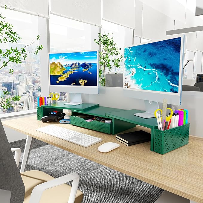 • Dual-screen office efficiency improvement: This desktop organizer is equipped with a dual-display stand, which can place two monitors at the same time, effectively expanding the workspace. It also has adjustable length (27.6-40.6 inches) and angle to provide you with a better viewing experience.