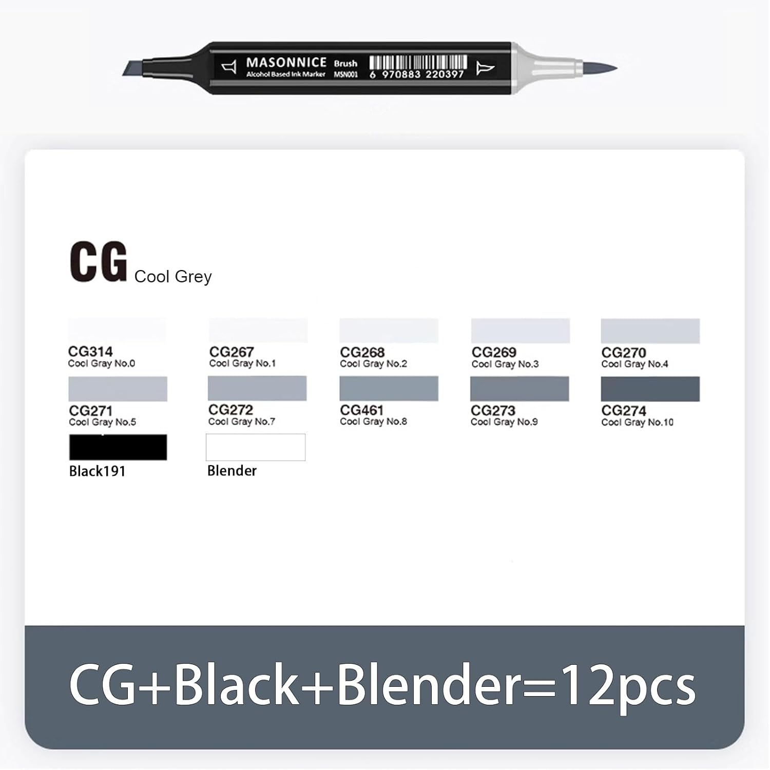 Gray Grey Alcohol Markers Brush Tip, 12pc Cool Grey Colorless Blender Markers Set for Adults Artist Coloring Book Shading Drawing Sketching Brush Chisel Tips Gifts