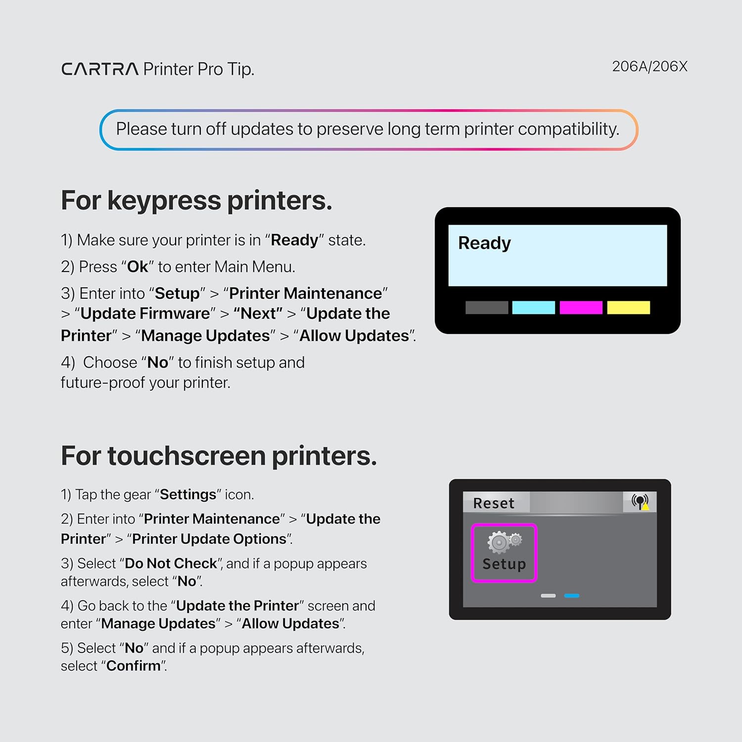 • Patented chip technology: Equipped with CARTRA’s patented chips, these 206A cartridges maintain a 100% connection rate with your printer, ensuring consistent quality and performance without any compatibility issues.