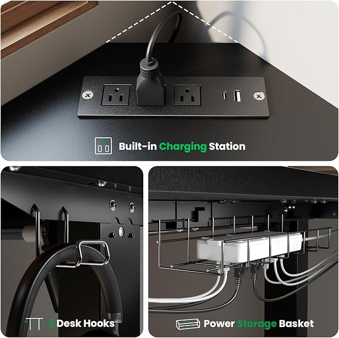 • 【Enjoy Easy and Convenient Charging】The L-shaped standing desktop features 3 AC outlets and dual USB fast-charging ports (Type-A/C) for all your devices. Built-in cable management with two headphone hooks keeps wires organized, maintaining a clean workspace effortlessly.