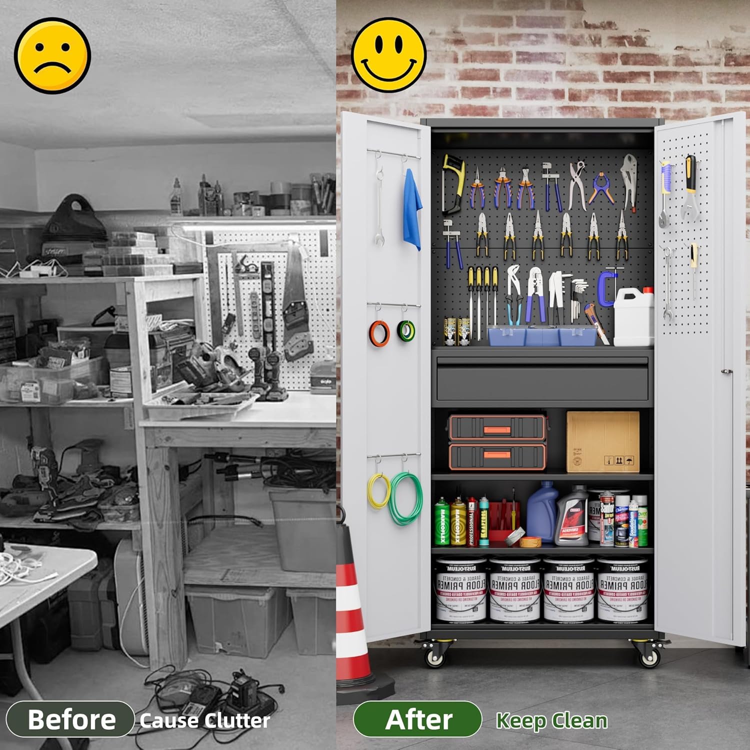 • 【1 Storage Drawer】Garage Tool storage cabinet with Wheels has 1 drawer in the cabinet to protect your private items. You can store important documents in it. The drawer is carried by two silent tracks, allowing for comfortable pulling.