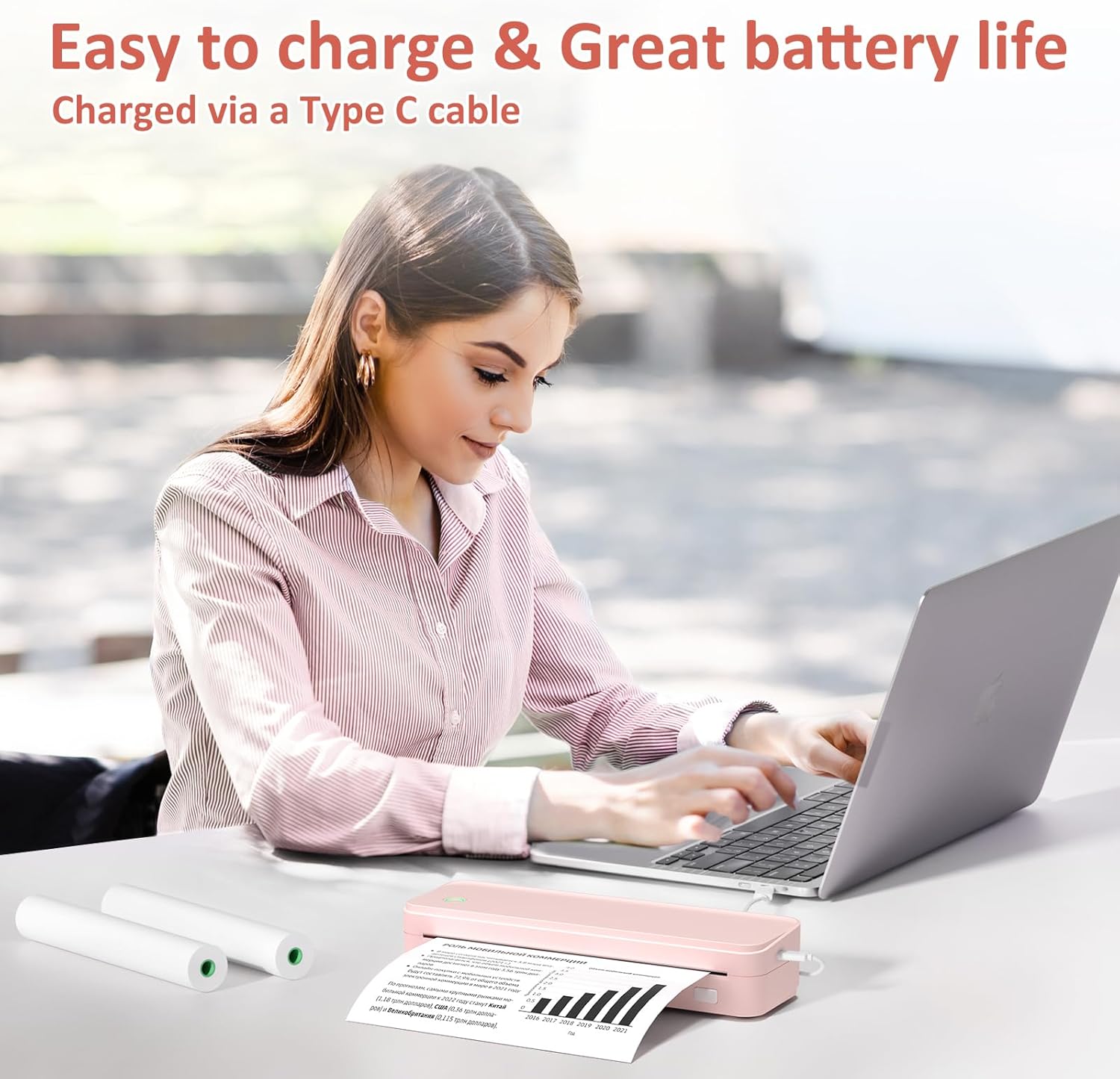 Inkless Portable Printer for Travel, Wireless Thermal Printer Supports 8.5 x 11 Inch US Letter Size, Bluetooth Machine Includes Carry Case and 3 Rolls of Thermal Paper Kit, Pink