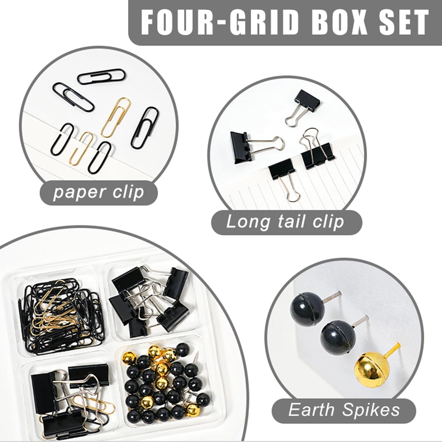 • COMPLETE SET: 10pcs office supplies, All-in-one includes 1 desk organizer for desk, 1 tape dispenser,1 tape, 1 stapler, 1 staple remover, 1 four-grid Clips Set (including 40 paper clips, 3 large binder clips, 5 small binder binders, 25 thumbtacks), 1000 staples, 1 ruler, 1 scissors and 1 pen for instant workspace setup