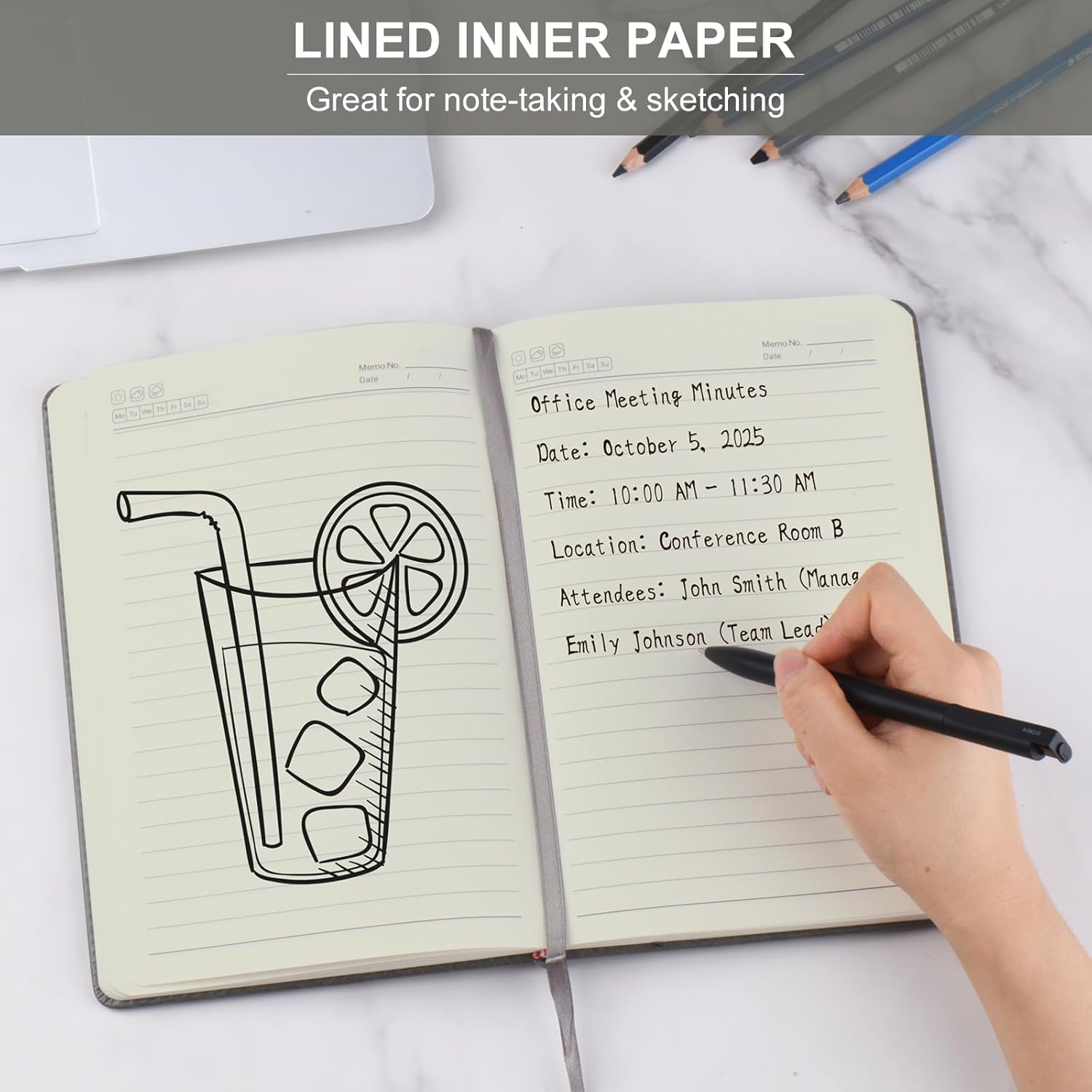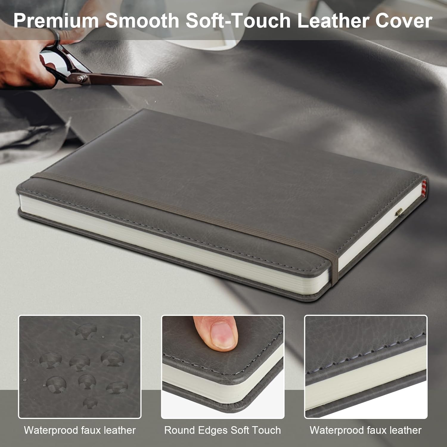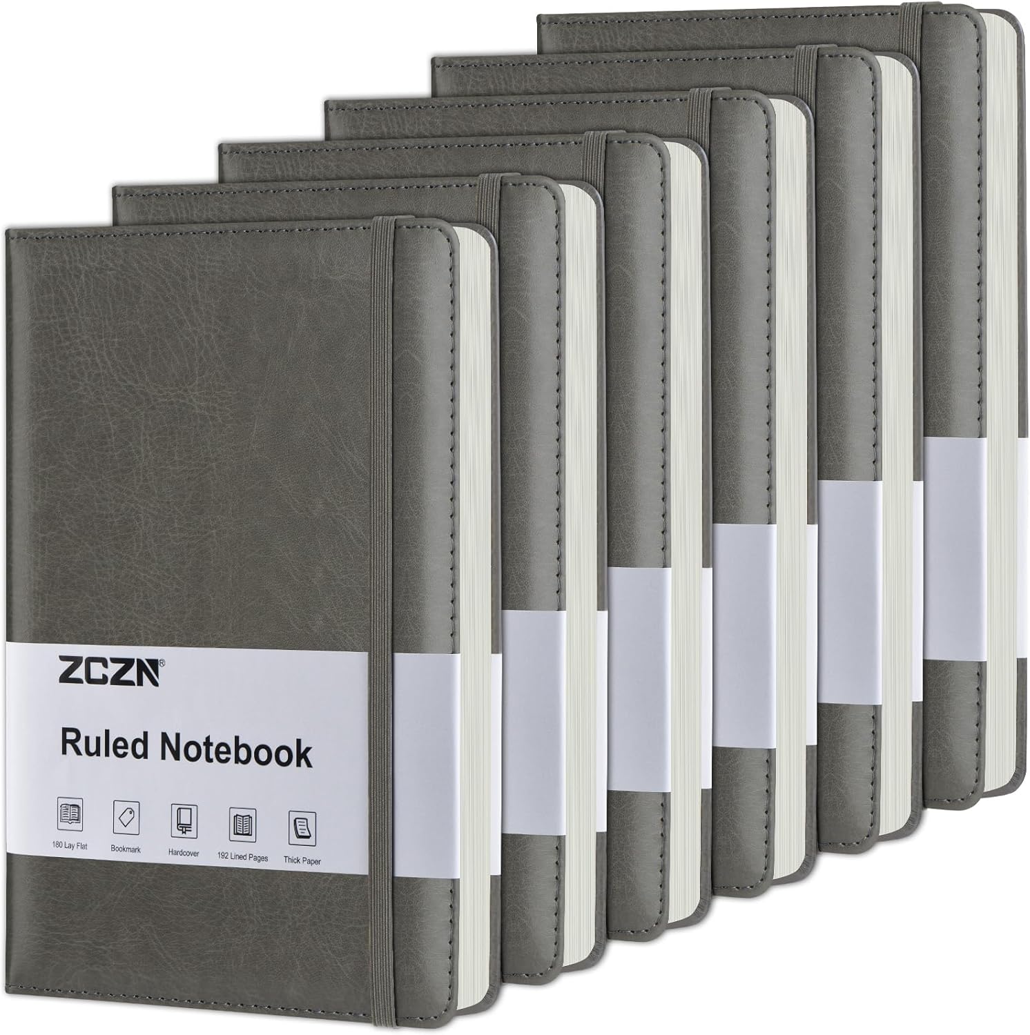 • 192 Pages Lined Journal Notebooks: 6 grey hardcover notebook, ,192 pages/96 sheets per notebook (1152 pages/ 576 sheets in total), adequate for work, meeting, studying. The paper of the leather notebook is thick enough that ink won't bleed through. The light yellow paper is more eyes comforting, release eyes burden when writing. It is the ideal notebook for work, school, meeting, travel and dairy.