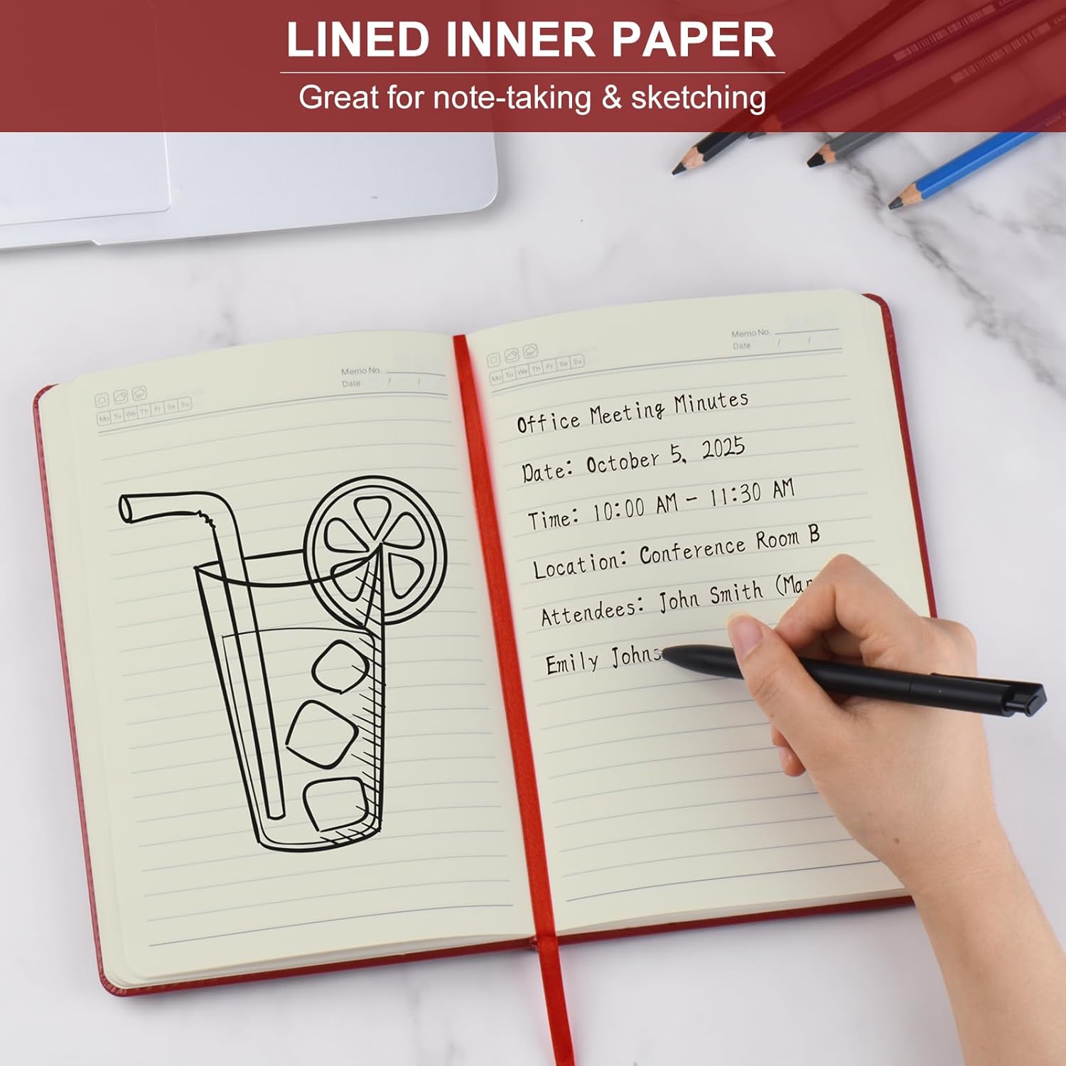 • 192 Pages Lined Journal Notebooks: 6 red hardcover notebook, ,192 pages/96 sheets per notebook (1152 pages/ 576 sheets in total), adequate for work, meeting, studying. The paper of the leather notebook is thick enough that ink won't bleed through. The light yellow paper is more eyes comforting, release eyes burden when writing. It is the ideal notebook for work, school, meeting, travel and dairy