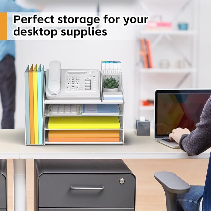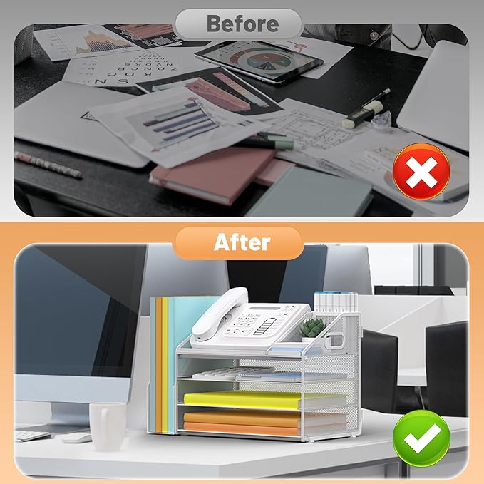 • 4 Tier Organization with Pen Holder: This White desk organizer boasts a 4-tier design for efficient sorting of your papers, letters, and other office supplies, along with a dedicated pen holder. It's perfect for maintaining a tidy and uncluttered workspace. The desk file organizer is an essential desk accessory that contributes to an orderly and professional atmosphere