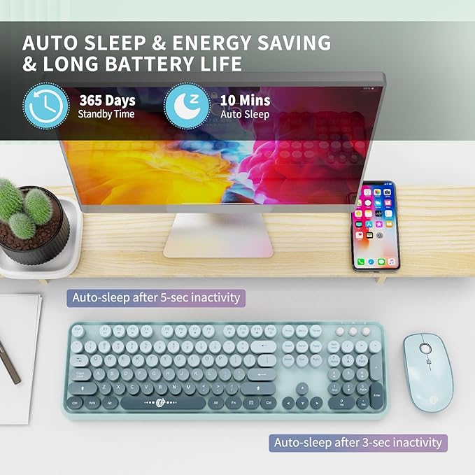 • 【 Wireless Keyboard Mouse Combo】The inspiration for these cute rounded keys comes from vintage typewriters offering you visual enjoyment and a retro feeling to type. With colorful key caps, make you be distinctive in the office and work full of fun.