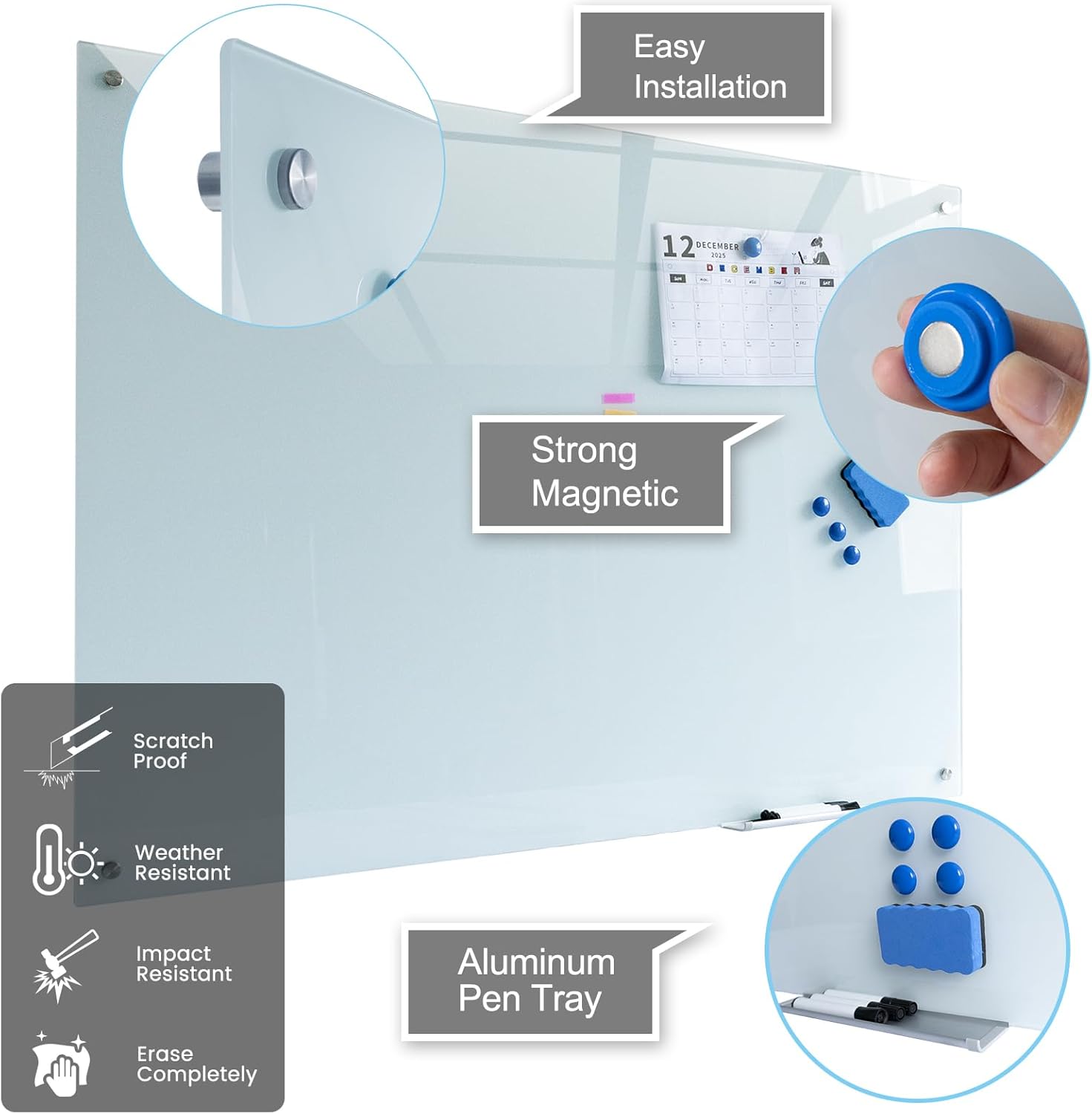 • ACCESSORIES INCLUDED – Measures 48" x72". Comes with removable accessory tray, 1 Magntic Wraser,2 markers and 2 high power glass board magnets.
