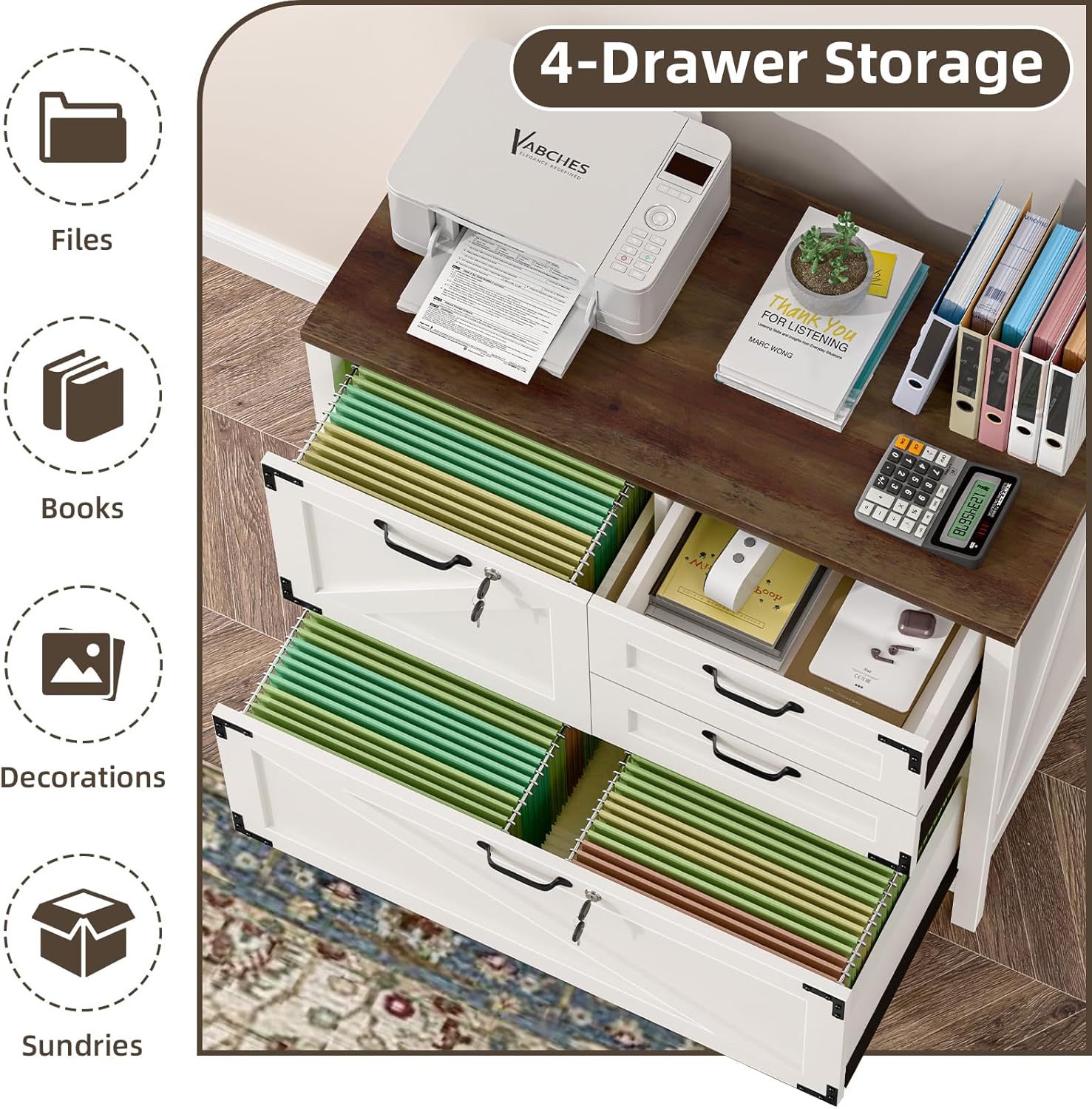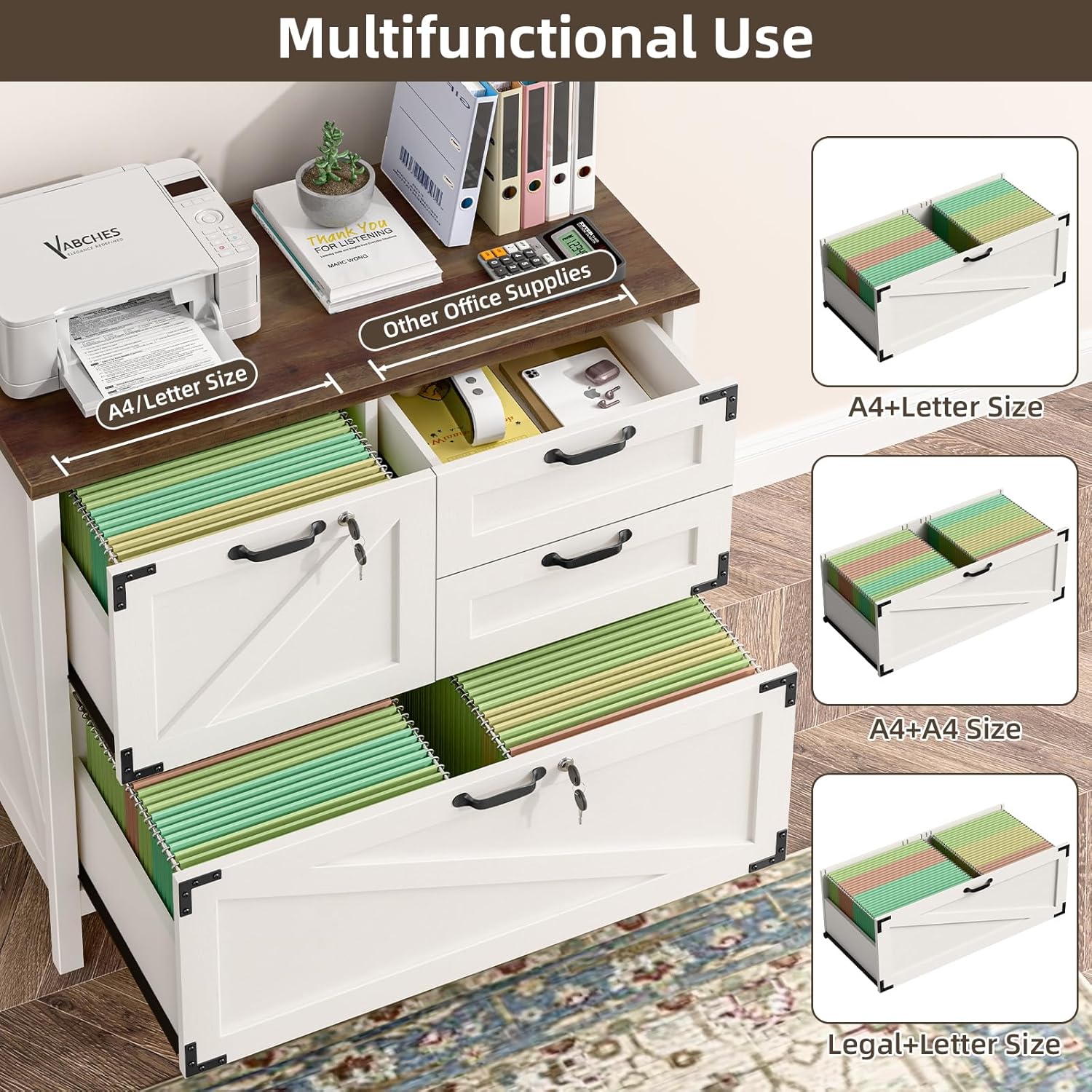 • 🖨️【Multi-functional Storage】This lateral file cabinet can be used not only for hanging files to keep your documents organized. It can also be used as a dresser or large nightstand for household items.The large 31.7"W x 15.75"D desktop is perfect for printers, scanners and more.