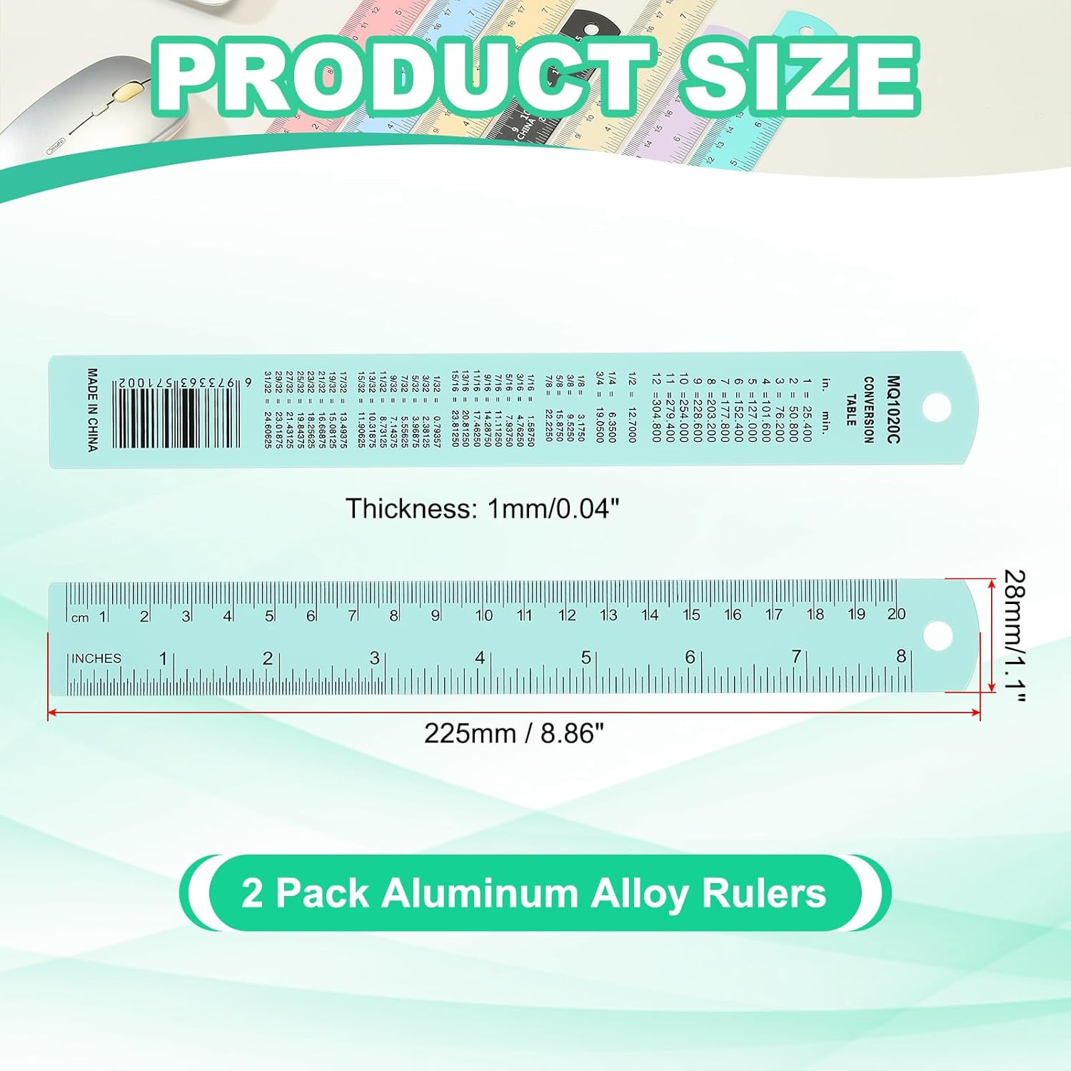 • Specification: Color: Blue Green; Material: Aluminum Alloy; Mileage: 20cm/8"; Total Length: 225mm / 8.86 inch; Width*Thickness: 28 x 1mm / 1.1 x 0.04 inch; Packing List: 2 Pack x Aluminum Alloy Rulers