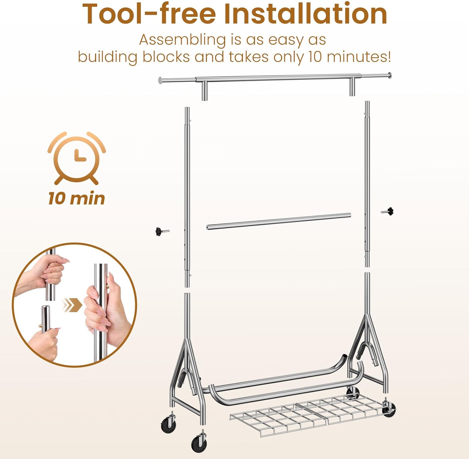 • 𝙀𝘼𝙎𝙔 𝙏𝙊 𝘼𝙎𝙎𝙀𝙈𝘽𝙇𝙀: The hanging clothes rack has been carefully designed with simple components, no need to worry about missing parts and tools. Secondary installation or disassembly can be done in 1 minute without tools, perfect for yard sales, seasonal storage, making assembling metal clothes rack easy and simple, saving you a lot of time. You can assemble our rolling racks with the help of the instructions or refer to our installation video.