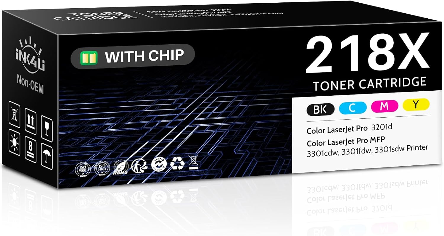 • 【Advanced Smart Chip Technology】INK4U compatible toner cartridges replacement for HP 218X toner cartridges 4 pack with chip, upgraded intelligent chip ensures instant printer recognition for HP Color LaserJet Pro 3201dw, HP Color LaserJet Pro MFP 3301cdw/3301fdw/3301sdw and seamless compatibility. No installation hassles - works like original cartridges.
