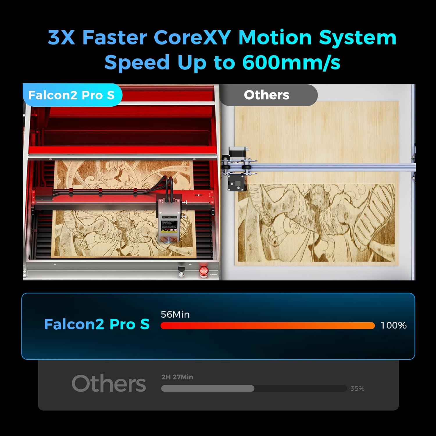 • Competitive Performance:The Falcon 2 Pro S 40W laser machine can effortlessly cut through 20mm wood and 20mm dark opaque acrylic in a single pass, saving you up to 50% of time compared to other laser machines. With a cutting speed exceeding 600mm/s and laser focusing down to 0.06*0.08mm for fine details, this machine offers precise engraving and cutting for a variety of materials, making it ideal for small businesses seeking high performance.