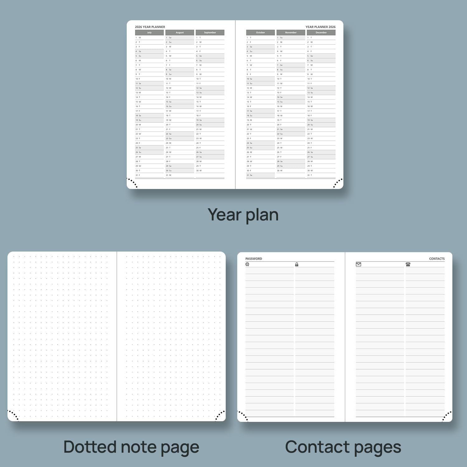 • EXTRA FUNCTION PAGES: This 2026 weekly planner also contains "2026-2027 Year Planner " Page + "2026 Holiday Reference & Calendar" Page + Monthly Expenses Page+ Contact & Password Pages + 8 Dotted Notes Pages for jotting down your ideas, thoughts or any other happy things in detail.
