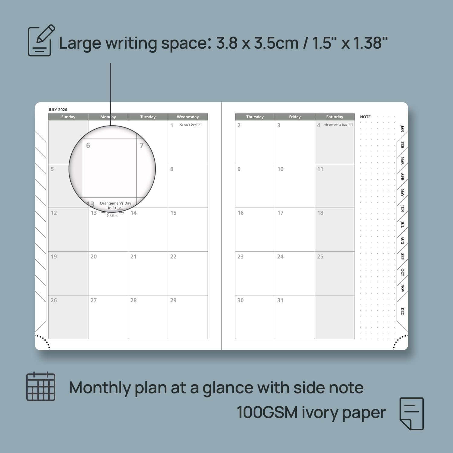 • BONUS FEATURES: The Tear-Off Corners and Stair-like Monthly Tabs enable easy locating of the current date. 2 Bookmark Ribbons are included to mark important pages.The Elastic Closure ensures the planner securely closed, while the self-adhesive Pen holder holds your pen. Additionally, the Foldable Pocket offers a convenient space to store important documents.