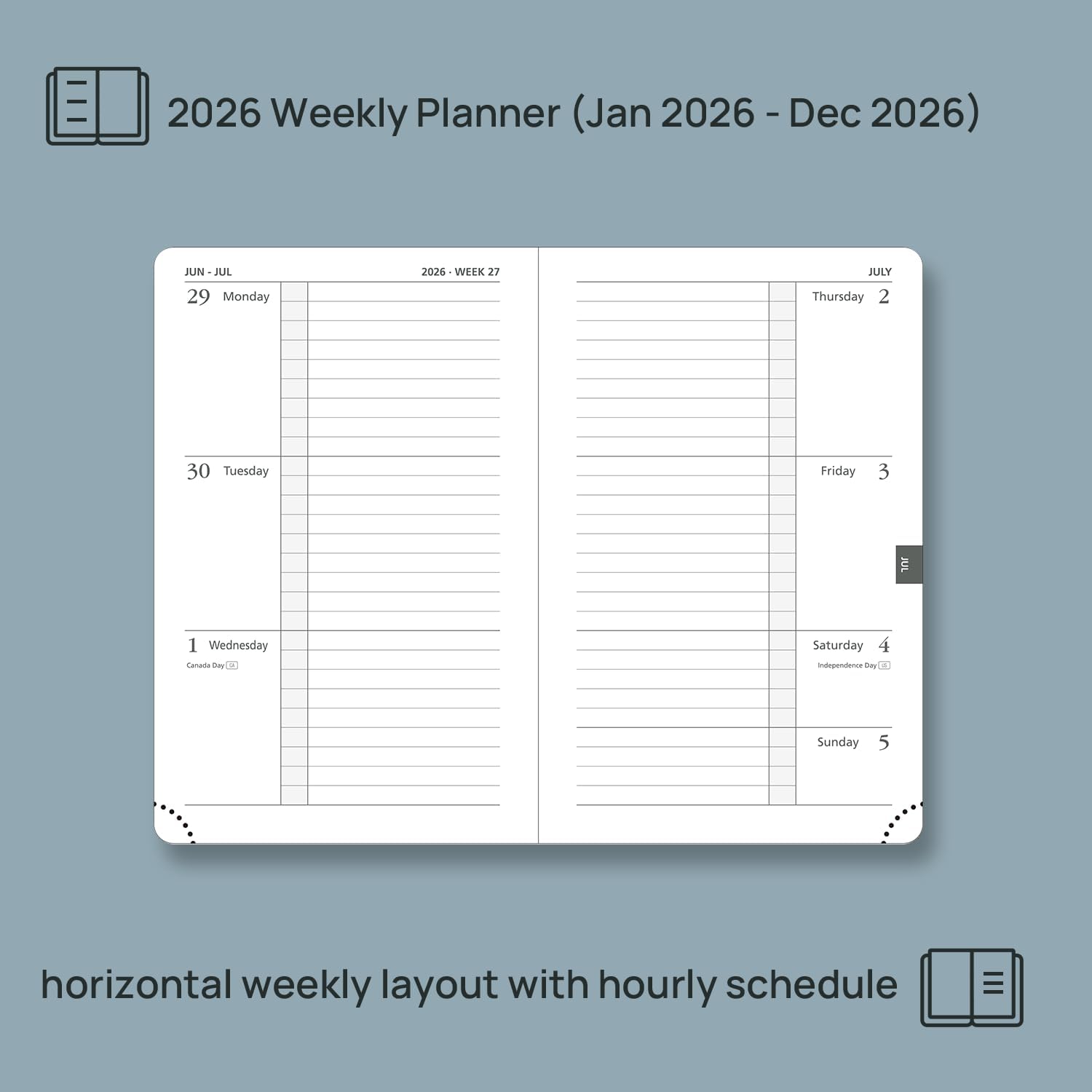 • JAN 2026 - DEC 2026 WEEKLY PLANNER: This planner covers 12 months of 2026 so that you can track the whole year's schedule easily. The size is Pocket 4" x 6.25", It is roughly equal to a moblie phone in height but with a wider width, which is comfortable to carry and use.