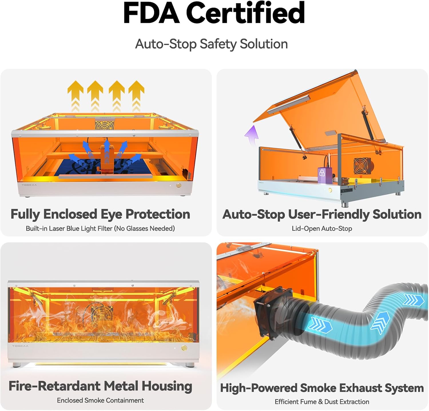 • 【Class 1 Safety Certified Machine】This certified Class 1 cutting and engraving machine provides safety assurance for users at all levels, from beginners to professionals. Its smart enclosure integrates powerful features including smoke exhaust, laser blocking, auxiliary lighting, and safety interlock systems. The 360° fully-enclosed lid filters 99% of laser emissions, eliminating the need for additional enclosures or protective goggles. The laser module instantly deactivates when the lid is gently opened, ensuring continuous protection for both you and your artwork.
