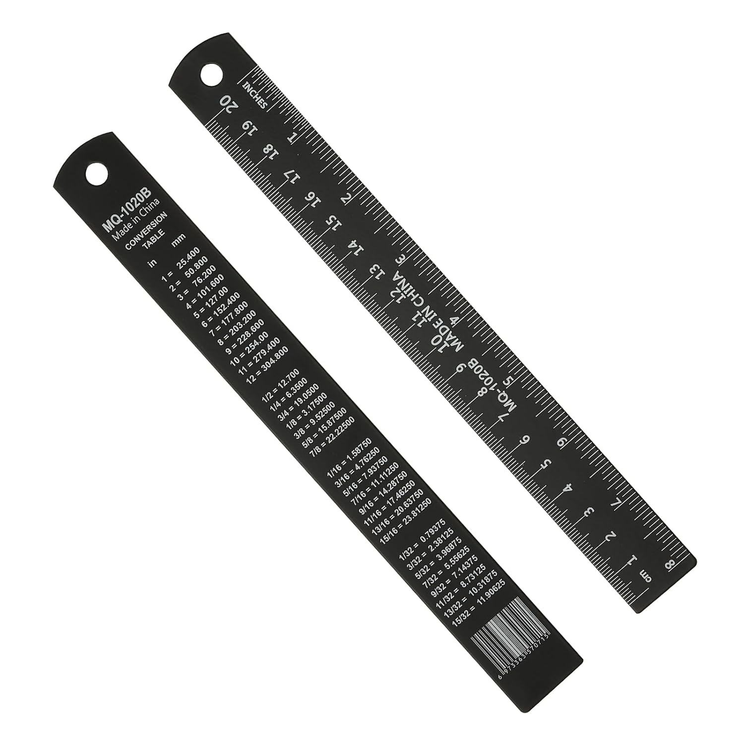 • Advantage: Made of quality aluminum alloy material, ensuring durability, rust resistance, and long-lasting use; Convenient design with rounded and smooth edges, hanging hole for easy storage, and compact size for portability. Laser etched and black anodized scales for bold, and never-fading markings; Double-sided markers with both inch and centimeter graduations, including a conversion table.