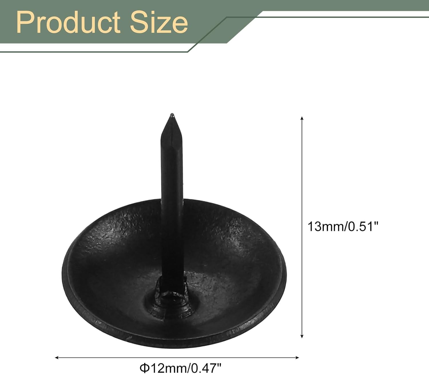 • What You Get - The package comes with 100 pieces of upholstery tacks, with the total height is 13mm/0.51inch, the head diameter is 12mm/0.47inch.