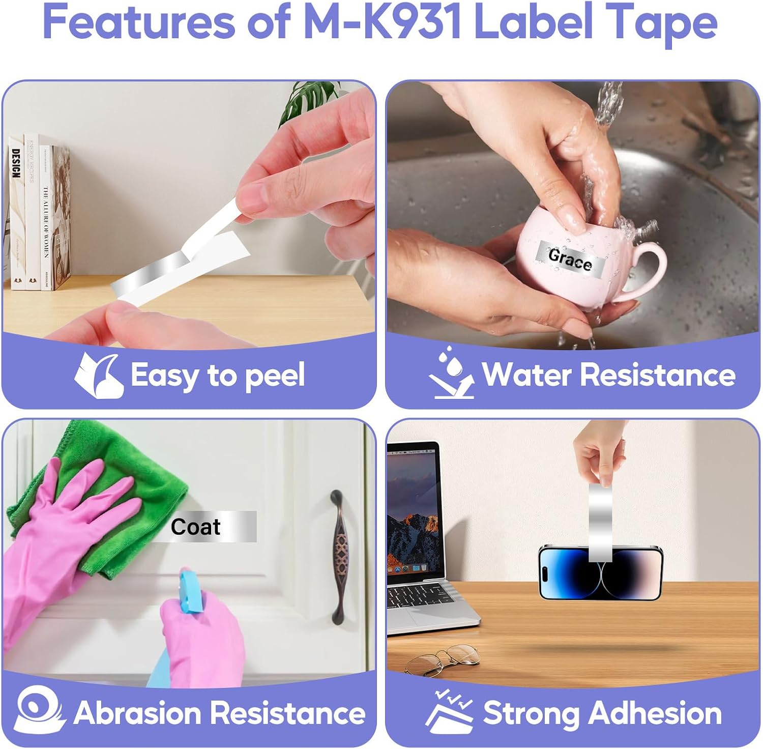 • NineLeaf 4 pack compatible for Brother p touch m tape M-931 MK931 M-K931 M931 M-K931S non-laminated label tape;Color: black on silver, length: 8m(26.2ft), width: 12mm(0.47 inch)