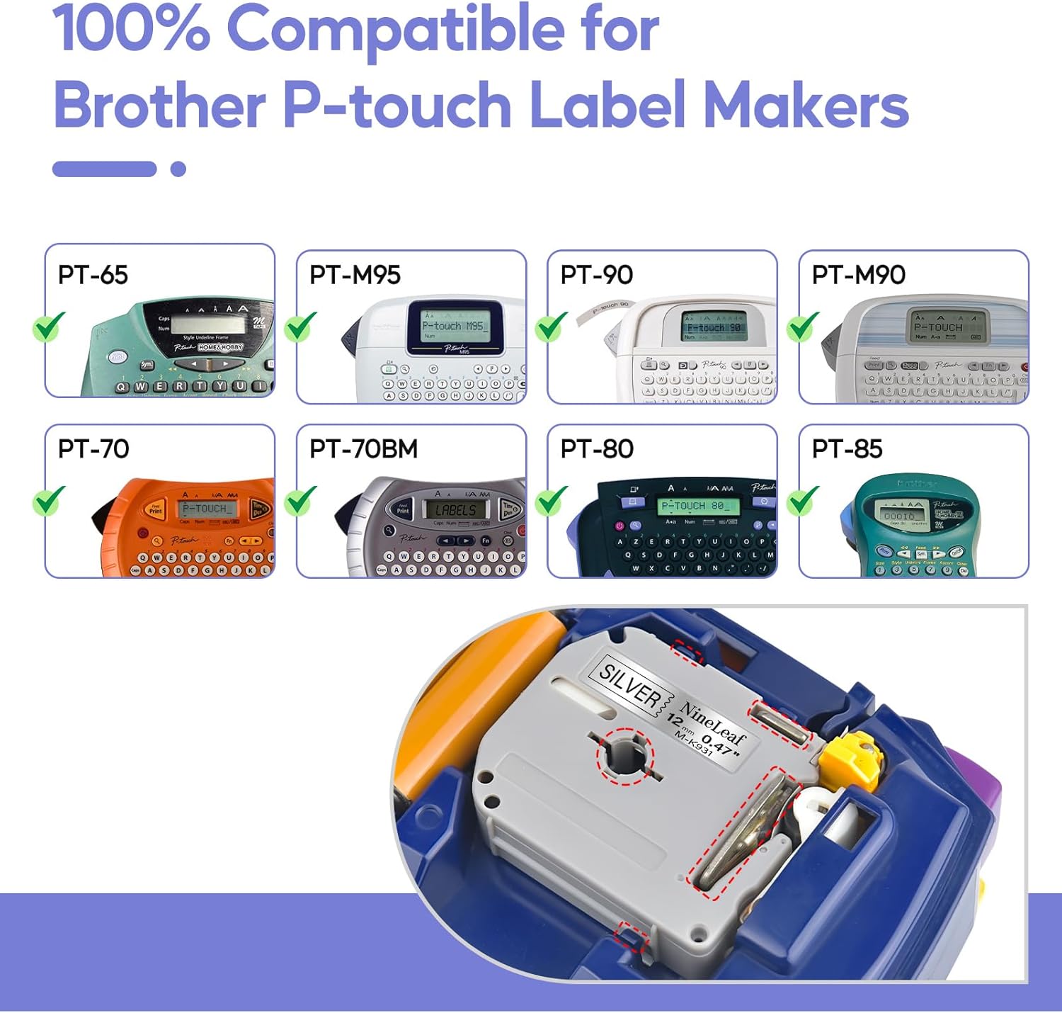 NineLeaf 4 Pack Compatible for Brother Ptouch M Tape M-931S MK931 M-K931 M931 M-931 M-K931S Tape 12mm 0.47 Silver Label Tape for PT-70BM PT-M95 PT-90 PT-70 PT-85 Label Maker Refills