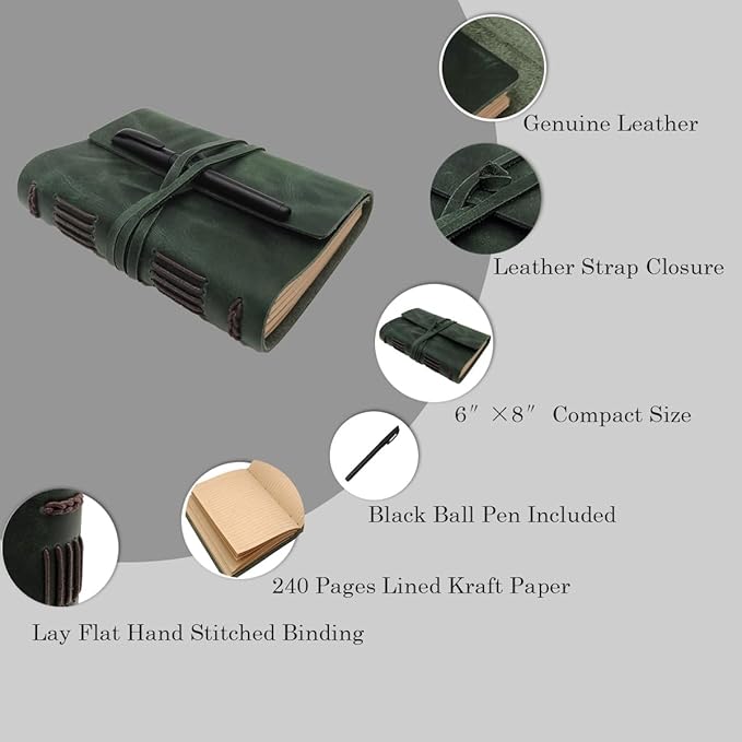 • PERFECT SIZE - Large green notebook journal Compact 8.5” x 6.2” size, Leather journal writing notebook easy to carry when travelling or in your daily life,Highly recognized leather journaling notebooks and leather journal lined